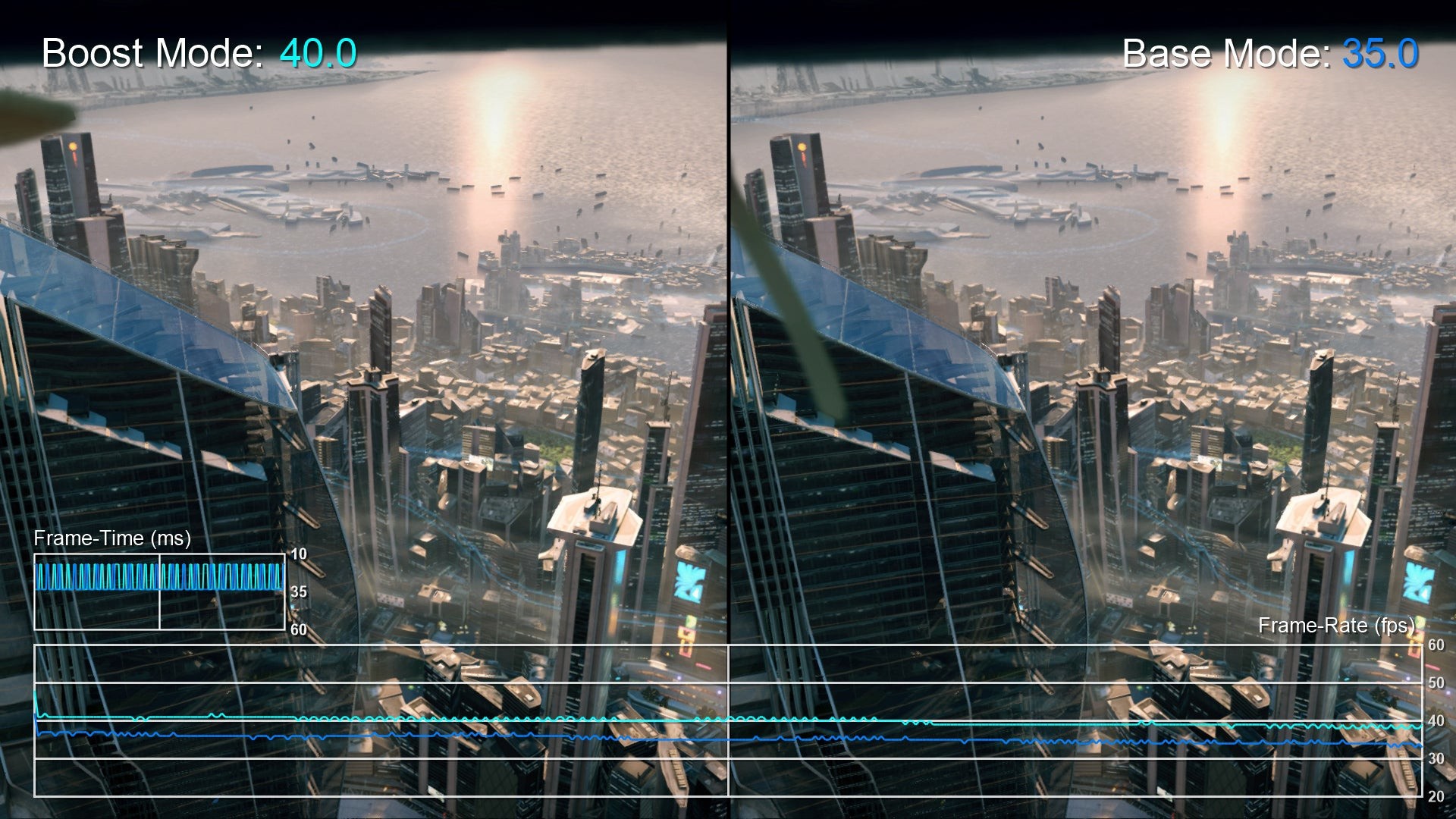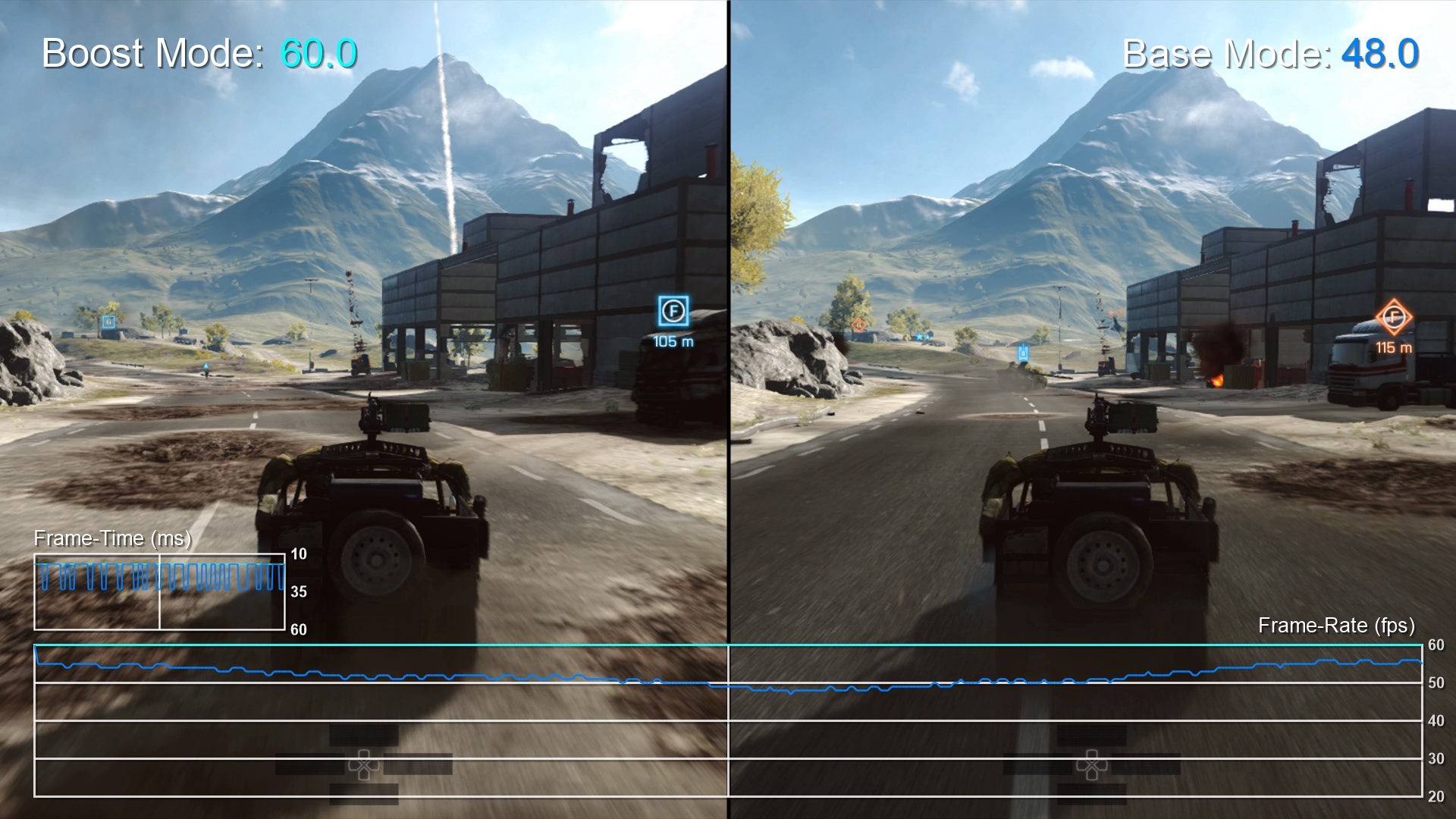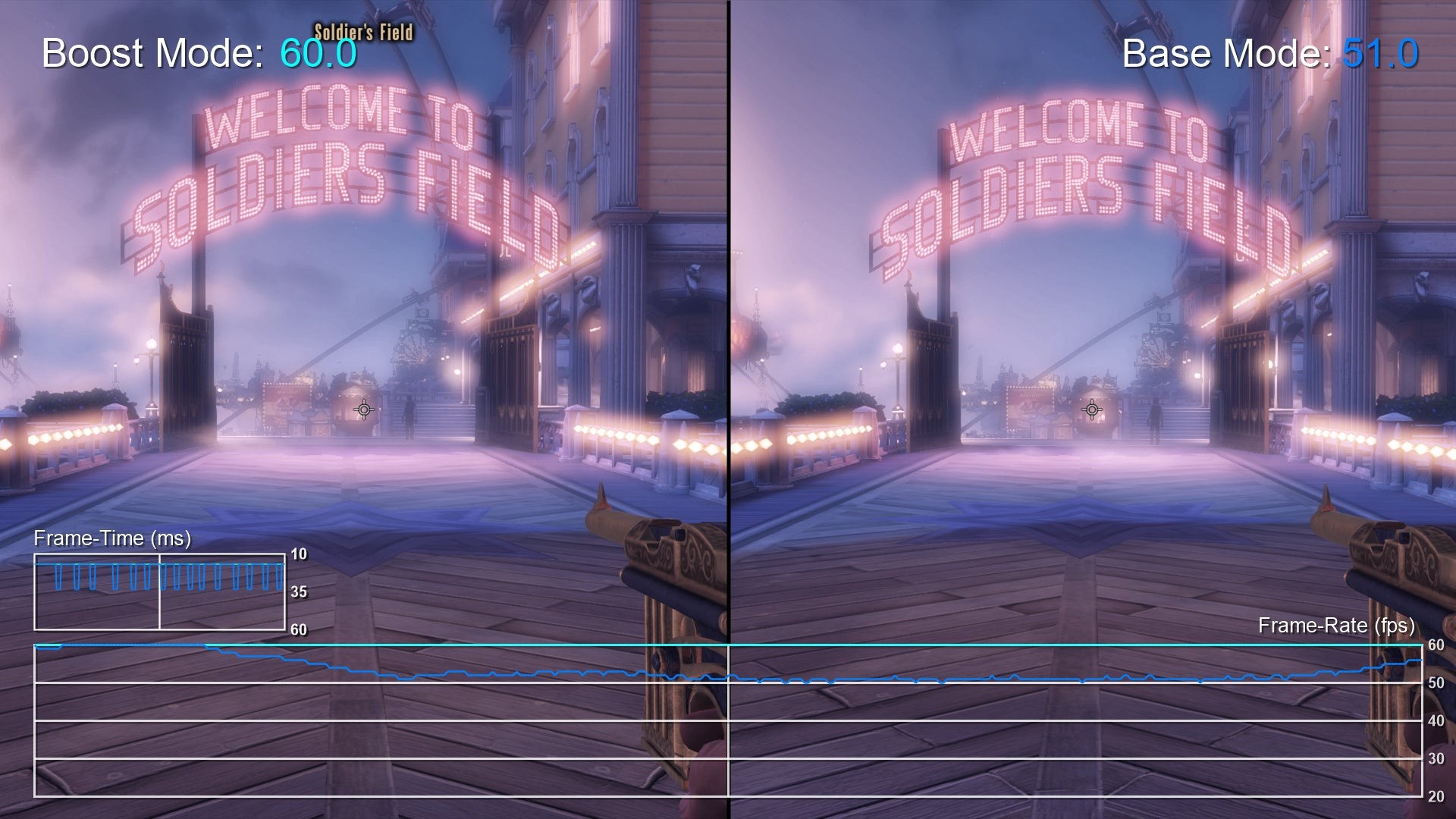 The working theory we have is pretty straightforward. In graphics-limited tests, boost mode consistently delivers a 14 per cent increase in frame-rate and we suspect that it is not coincidence that the GPU clock speed bump from base to Pro hardware is 111MHz - pretty much exactly 14 per cent. The suggestion is that when running base mode with boost active, the Pro 'half' of the larger GPU remains inactive, but additional clocks are deployed instead.