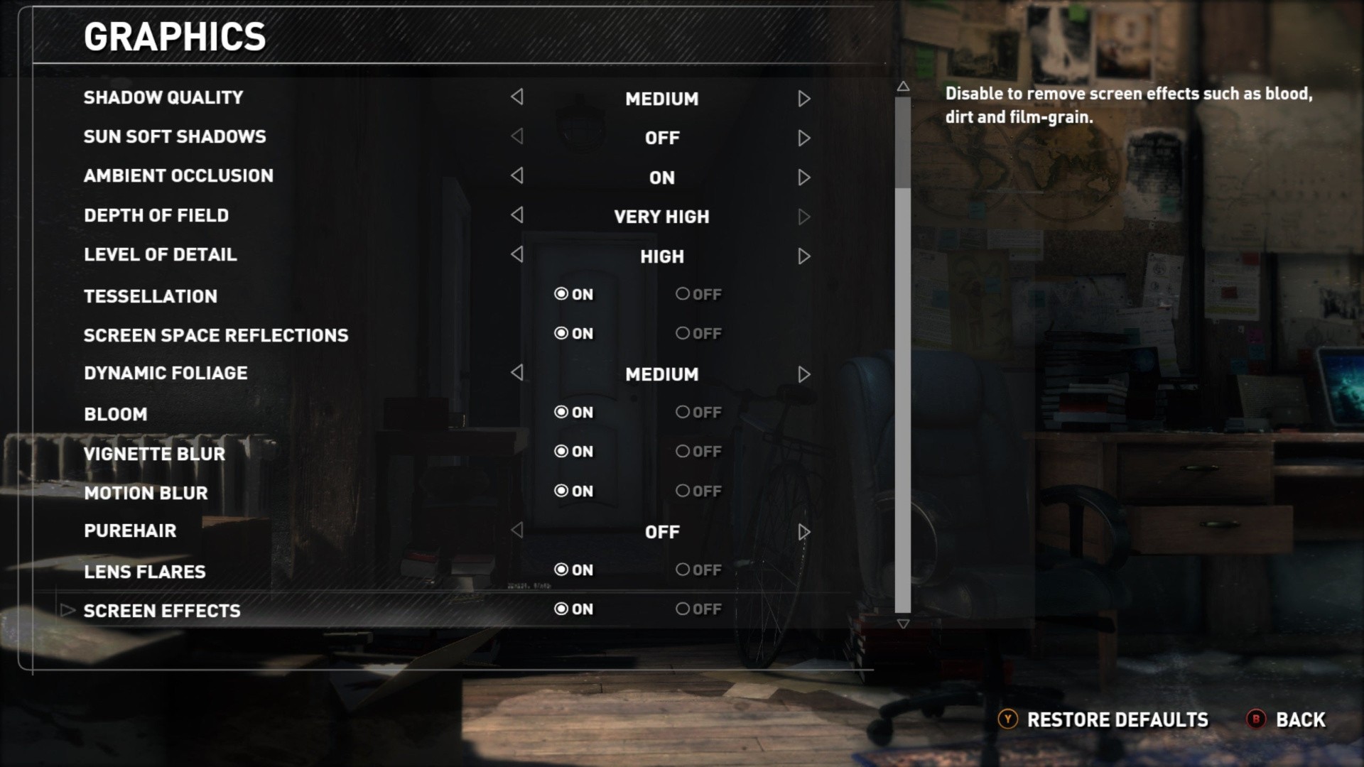 Bloom, Vignette blur, motion blur, lens flares and screen effects: All five of these settings are toggles and each of them is enabled on Xbox One. Of the five, only motion blur seems to incur any noticeable performance hit while the rest appear to be available for those that wish to tweak their presentation. If you prefer playing with lens flares and bloom, for instance, you can do it.