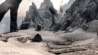 In terms of image quality, all these shots come in at 1920x1080, as backed by FXAA. Shader effects are reworked for water and snow-capped surfaces too, and it's here we see a more substantive change than the regular textures shown so far. Icy surfaces are inflected by a sparkle - a reflective quality missing from the original release's flatter normal maps. It's also in Skyrim's frostier areas that the addition of volumetric fog is most obvious, used to great effect here by creating a sense of rising condensation in the air.