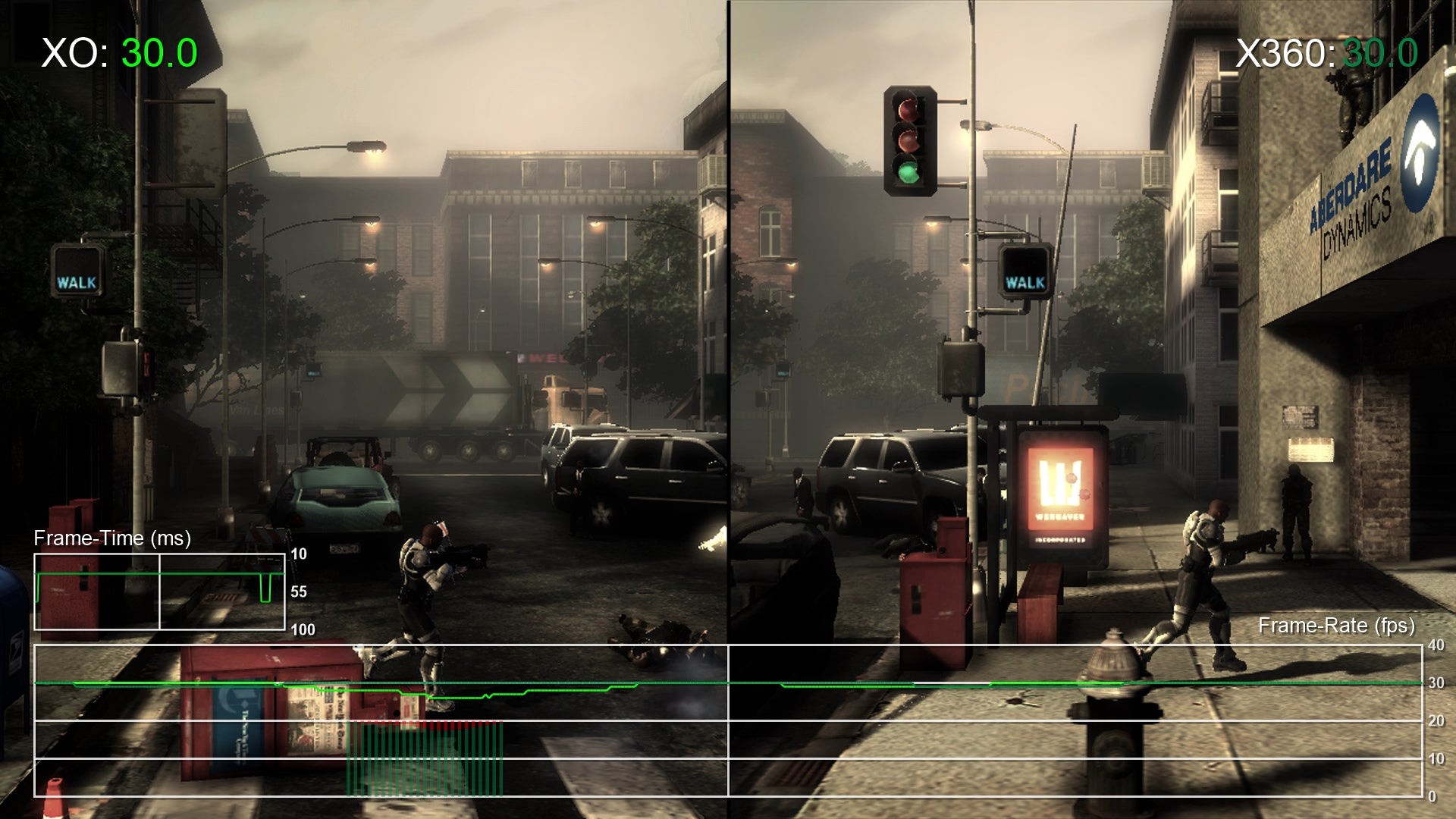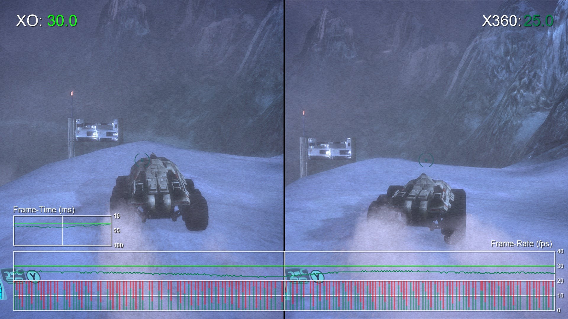 Here's the same section of footage captured on Xbox One, and on Xbox 360 with full v-sync and 'smart' adaptive. Xbox One matches Xbox 360's adaptive performance and doesn't drop down to the 20fps seen on original hardware when v-sync is engaged.