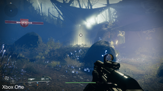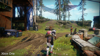 Thrown into the misty forests of the European Dead Zone, there's simply a more organic, developed look to the game's planets. Take the new Farm hub area as an example: the attention to detail is a big upgrade over the original Destiny's tower. It's the small touches that make up a grander picture; the detailed brickwork surrounding the fountain, and the books and abandoned monitors lining the hangar. It's the turn of the watermill, with rippling water showing off the game's eye-catching reflections, complete with anamorphic lens flare and bloom. It's even the moss draping around giant, rusting structures to the Farm's edge, and swaying army camouflage overhead, creating dynamic shadow details on the ground. And yes - it may be basic, but physics are used on the outskirts to create a throw-away football mini-game.
