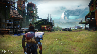 The outlook is great on PS4 Pro when outputting at 4K, and it's good news for 1080p screen users too. If you own a full HD display, you still get that 4K picture super-sampled to your 1920x1080 output - an essential feature bizarrely absent from many Pro titles. What that amounts to is less flicker, less shimmer, and less noise on sub-pixel details in general- the kind that's easy to spot around the Farm hub area.
