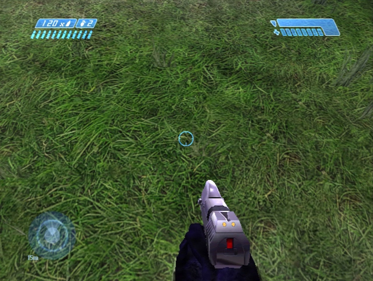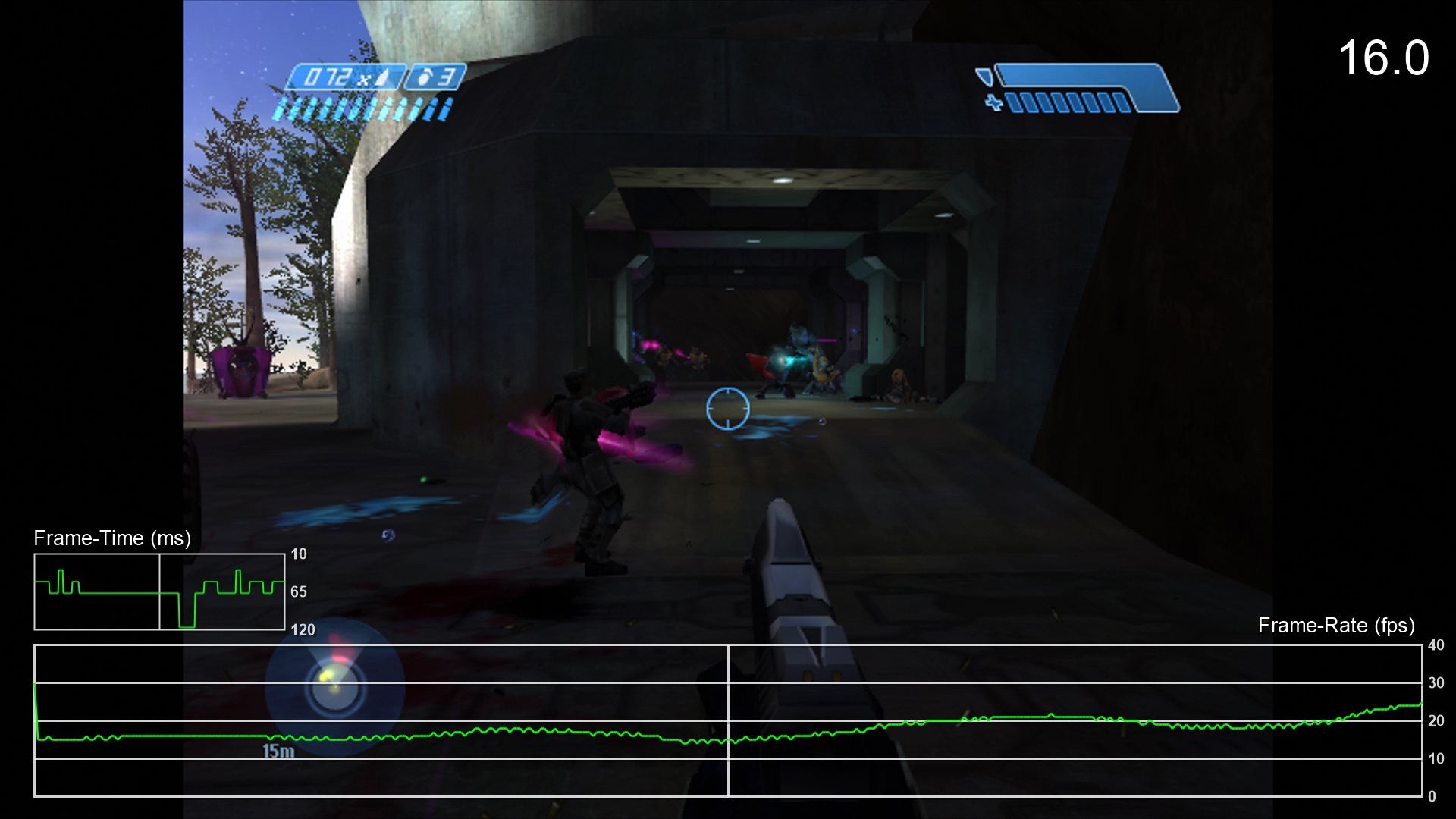 Unfortunately, when you step into any large firefight, things start to bog down with dips into the low twenties and sometimes even below. It's best to keep in mind that this was a large scale shooter from 2001. Other first person experiences on consoles at this point were generally much slower in terms of performance or focused on small levels. Halo certainly ran much better than any last generation shooters on Nintendo 64 or the PlayStation as well. In fact, if you look at the raw numbers, it's pretty comparable to many PS3 and Xbox 360 era games as well.