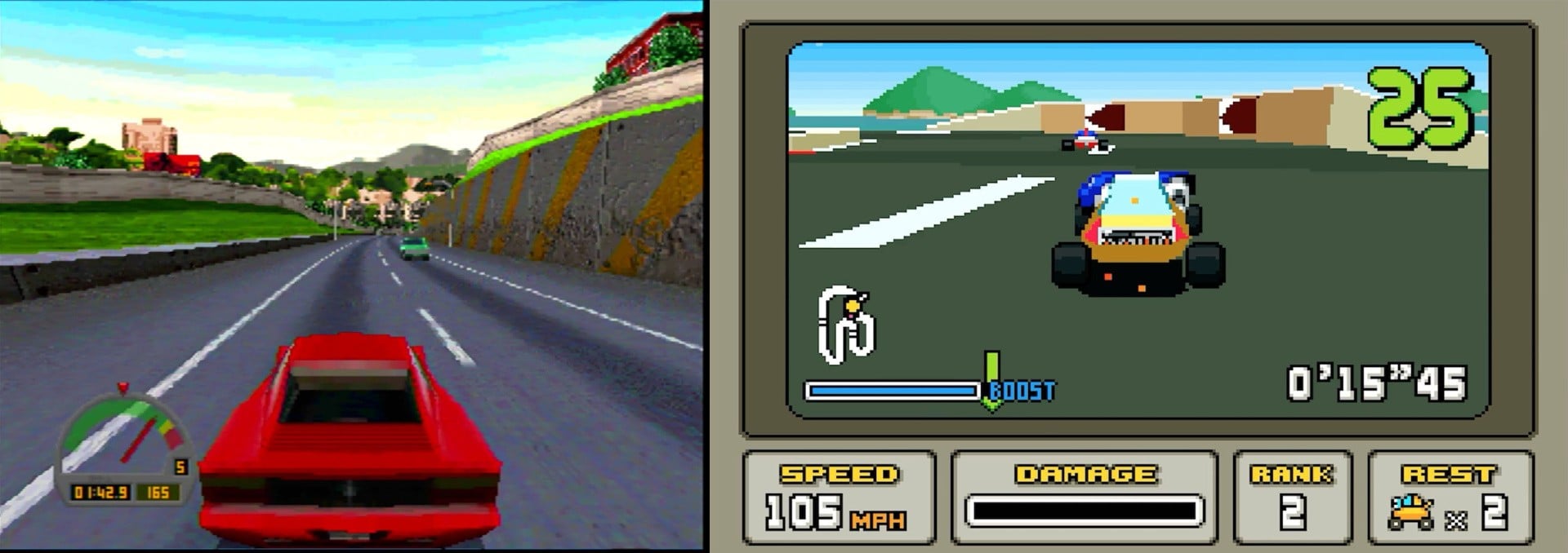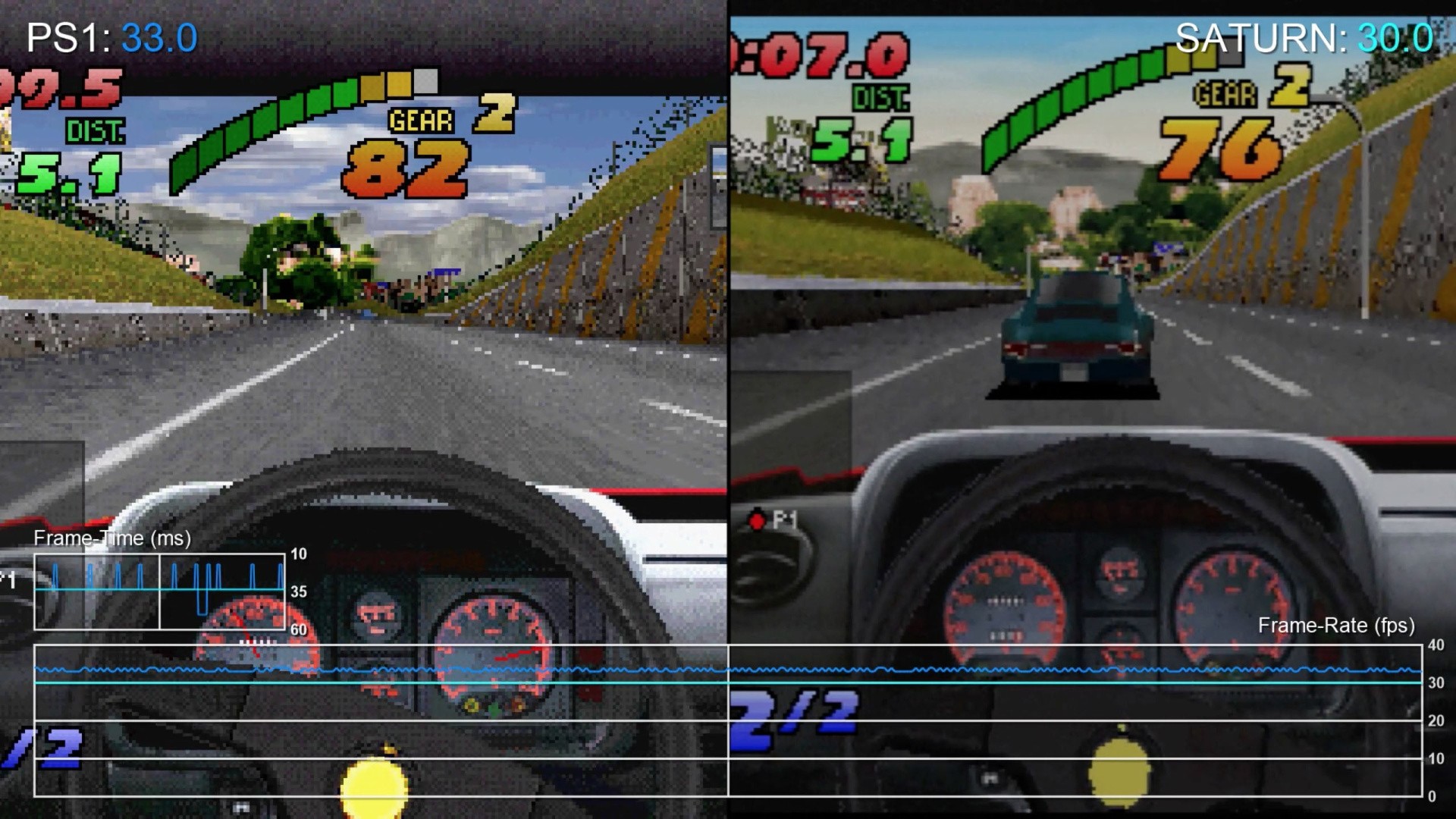 While the Saturn and PlayStation conversions were very similar, there are several differences to point out here. For one thing, when using the cockpit view, Sega's console is lacking working instruments - a feature that is present in every other version of the game. The two-dimensional background graphics also vary between them - PlayStation features a wider range of backgrounds and restores the scaling feature from 3DO. We also noticed subtle graphical touches on Sony's machine including a faked lighting effect applied to the car as you drive through a tunnel, perhaps inspired by Namco's Ridge Racer.