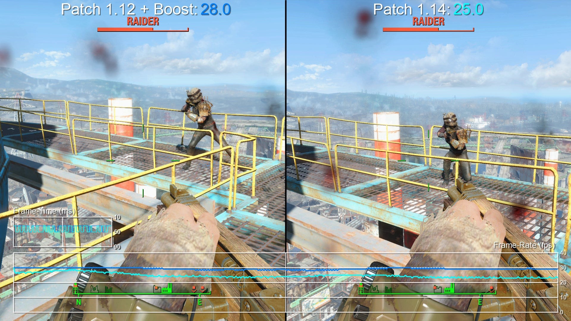 As luck would have it, we had another PS4 Pro in the Digital Foundry office without Fallout 4's Pro patch installed - specifically, patch 1.12. To be clear, this features no visual upgrades whatsoever, where draw distances, resolution and lighting are exactly as they were on base PS4 hardware. However, the frame-rate results are fascinating when compared to 1.14, and it turns out Fallout 4 does indeed run faster on boost mode without the latest patch installed. In our stress test on the Corvega rooftops for example, the dips to 23fps seen patch 1.14 are eliminated, leaving us with a clean 30fps line on patch 1.12 - provided boost mode is checked, of course.