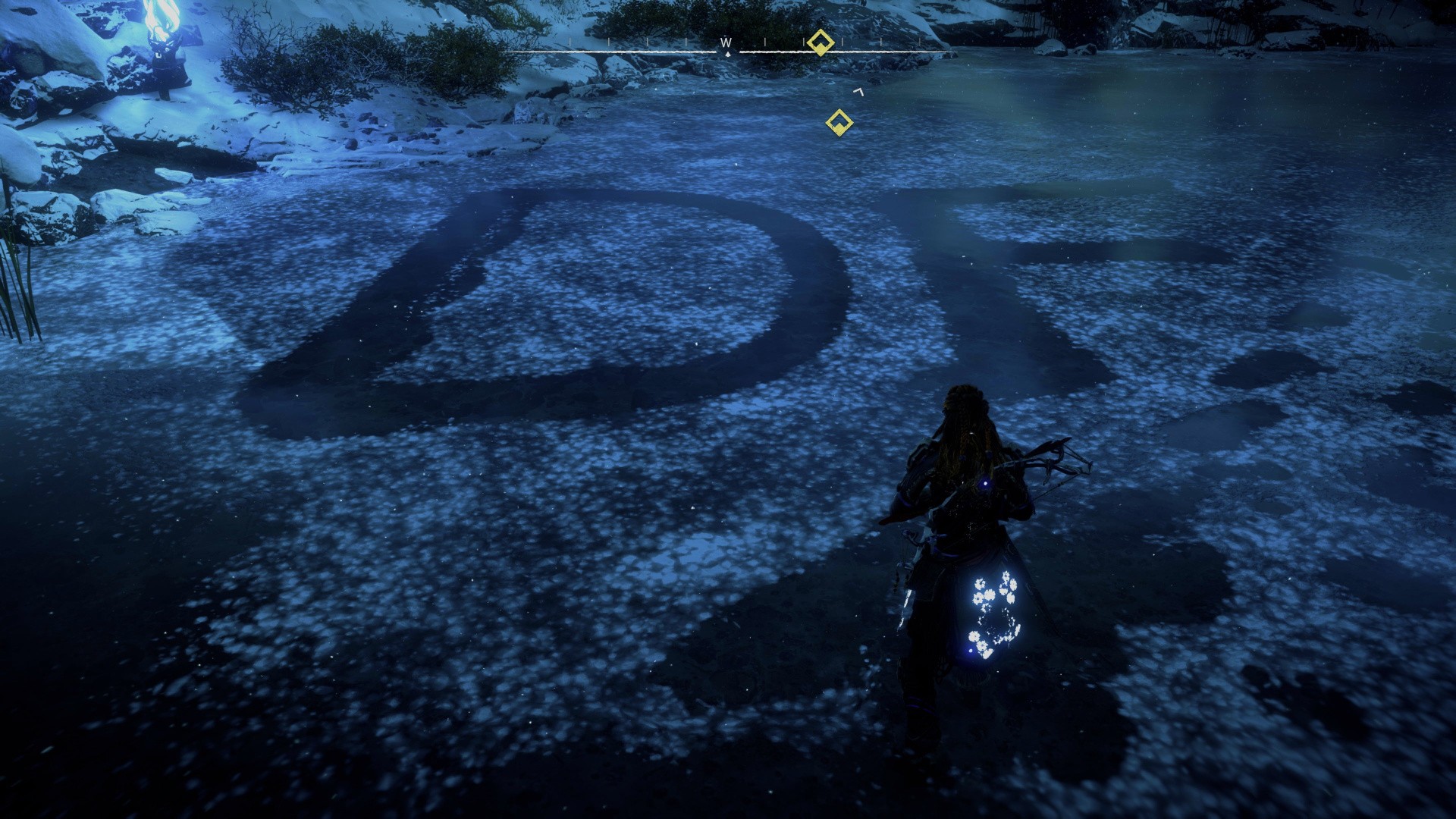 All of this is complemented by a gorgeous colour palette. The artists have carefully selected just the right combination of colours for every scene - from the pink glow of sunrise to the freezing mountain tops, the depiction of dramatic light and colour is top notch here. Another nice addition to the game can be found in pools of water. While the implementation of screen-space reflections still falls short of expectations, these freezing pools and rivers now feature an interactive icy layer across the surface. As you walk through the water, Aloy leaves trails behind not unlike the snowy landscape. These trails are persistent as well - provided you remain in the general area.
