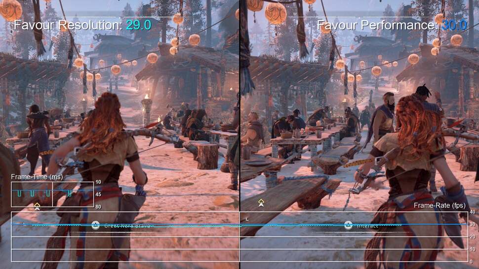 Resolution is pegged to 1080p when you enable the 'favour performance' mode, but instead of letting the frame-rate run as fast as it possibly can, Horizon opts to use GPU power to more closely lock to the target 30fps instead. It's an interesting idea, but fundamentally not that much of a game-changer - simply because Guerrilla's performance at 4K is already so good with only very minor drops (if any) in most areas.