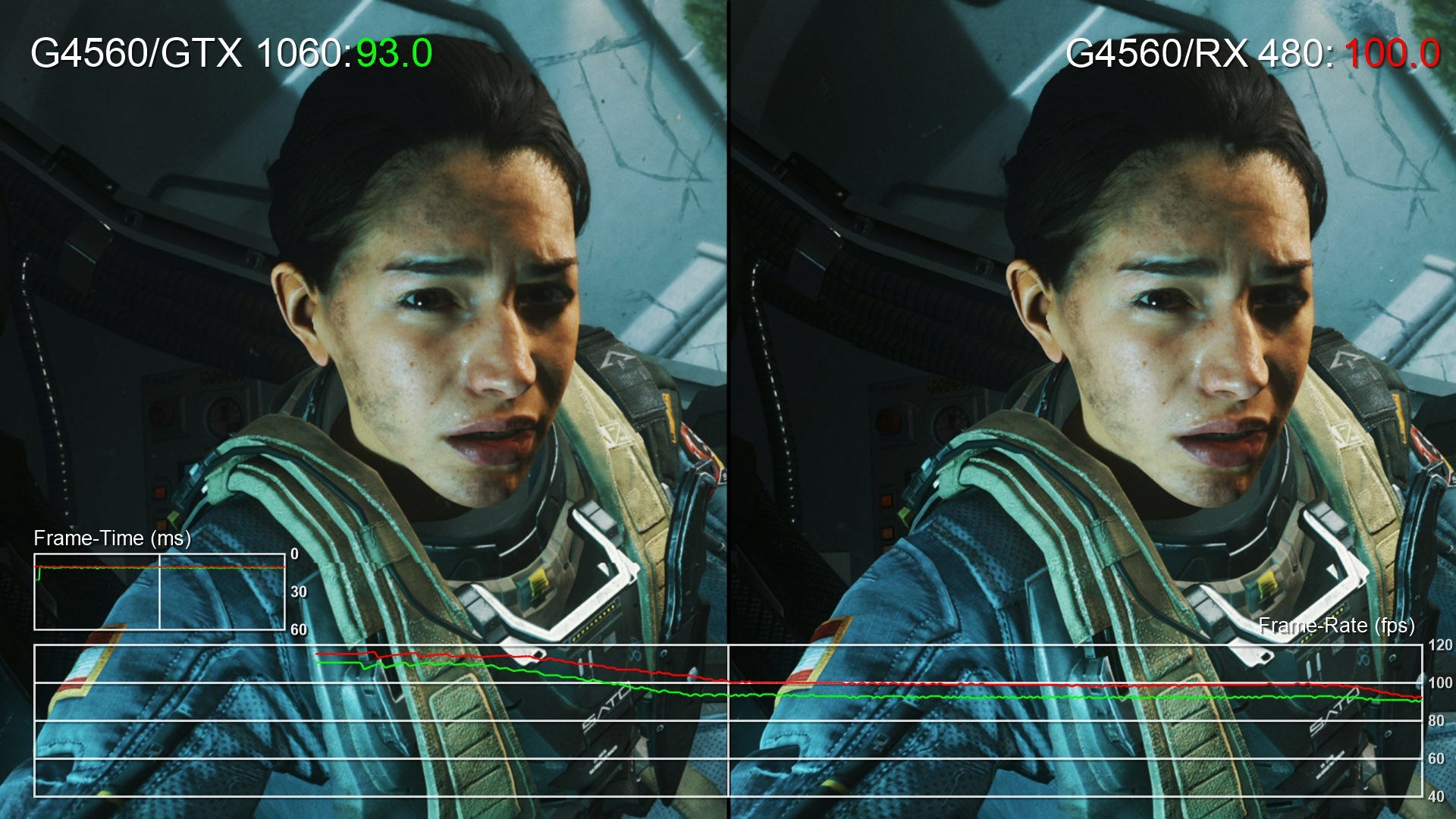 Check out the shot above (click on the thumbnail for the full resolution image). Call of Duty: Infinite Warfare runs faster on AMD's RX 480, compared to its Nvidia rival, the GTX 1060. It's an advantage that plays out consistently, as you can see in our Infinite Warfare PC performance analysis. But here's the thing: running these GPUs with an i7 - as we did above - essentially offers something akin to a bottomless pit of CPU power, and the balance of power between the green and red teams changes rapidly when you pair each GPU with a less capable processor, like the Pentium G4560 we're reviewing here.