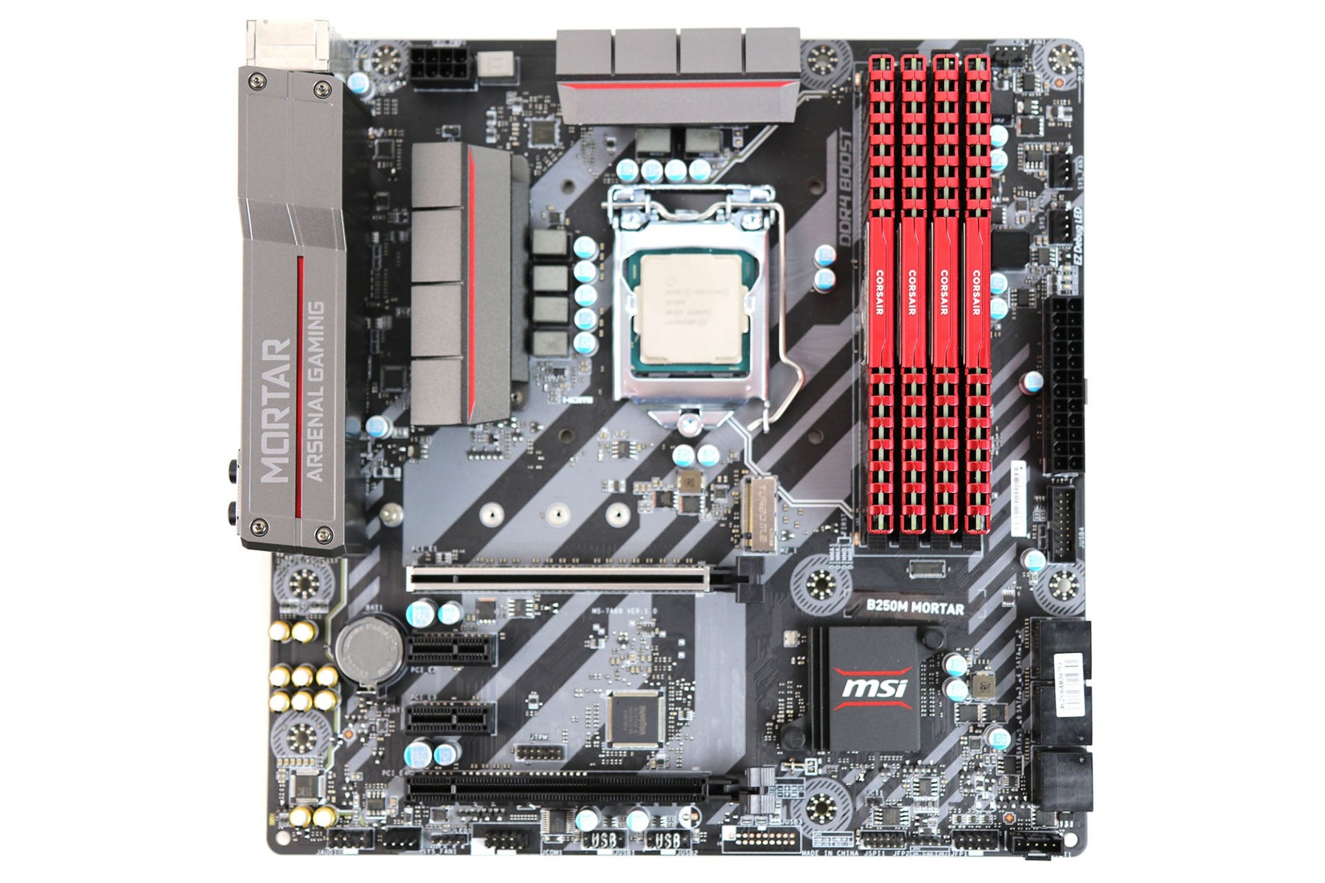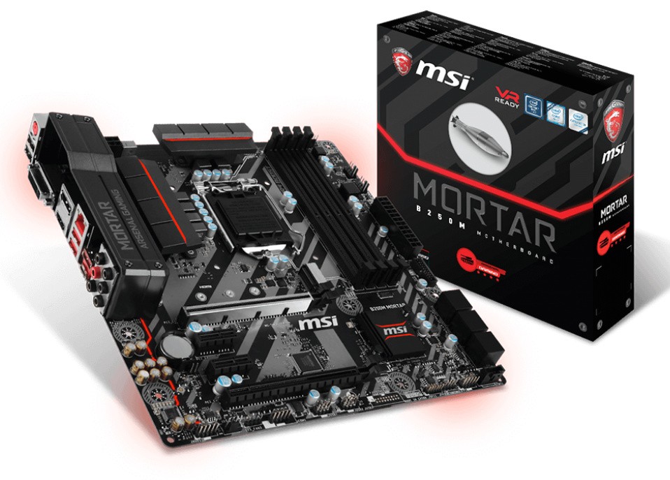M.2 SSDs and even Intel Optane are fully supported on the B250M Mortar, and there's no shortage of fast SATA-3 ports for hooking up and getting the most out of standard solid state storage. Intel supplies the LAN technology (which features power surge protection support) and sound is taken care of with MSI's Audio Boost. USB 3.1 is fully supported, and there's a reversible Type-C socket on the rear. Multi-GPU is also supported via AMD's CrossFire, but Nvidia SLI is off the table.