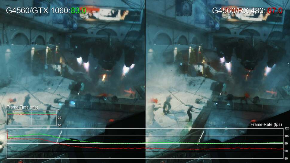 And you can see that in the shot below, taken mere seconds later. As soon as the action intensifies, the RX 480 suddenly loses a lot of performance. Minimum frame-rate actually hits 45fps in our tests - 20fps lower than the GTX 1060. And that's important when choosing a graphics card to pair with a less capable CPU. AMD's DirectX 11 driver lacks multi-threading capabilities and is significantly less optimal than Nvidia's, meaning that when the CPU is taxed, certain titles lost a lot of performance (and we stress, not all games exhibit the issue, but you have no guarantee which titles will be affected and which are fine).