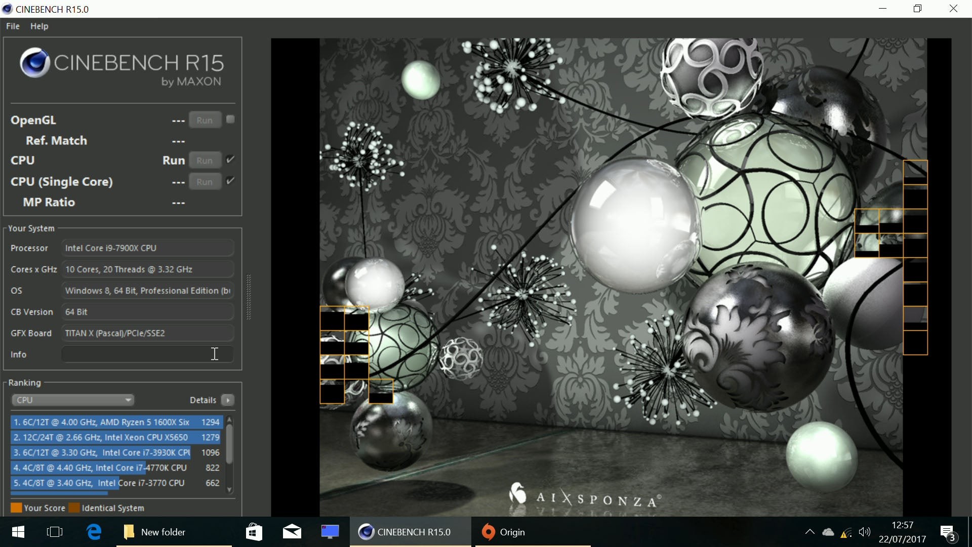 Cinebench renders this scene by allocating one 'tile' to each CPU thread in the multi-core benchmark. Here you can see the Core i9 7900X with its 20 threads in action.
