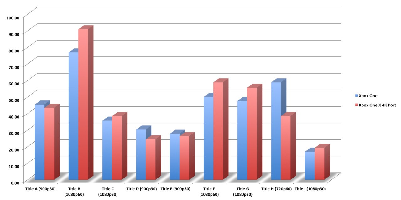 Also worth bearing in mind is that these PIX results represent a single 'snapshot' of GPU activity - and GPU load varies dramatically throughout any given game. However, we can assume that they were chosen by Microsoft to be representative of how games scale from base Xbox One hardware to Xbox One X. While we've converted the metrics to frame-rate from the original frame-time (in order to make the information easier to absorb - original data is included as well in the charts below), it should be pointed out that this data is based on GPU time alone, and stands apart from any frame-rate cap the final title may implement. So for example, frame-time on Title B (almost certainly Forza Motorsport 7) is 13ms on Xbox One and 11ms at 4K on Xbox One X. An 11ms frame-time would translate to 90fps but obviously the final game locks to 60fps - as we know, Turn 10 will be using that overhead for improved visuals on the new console.