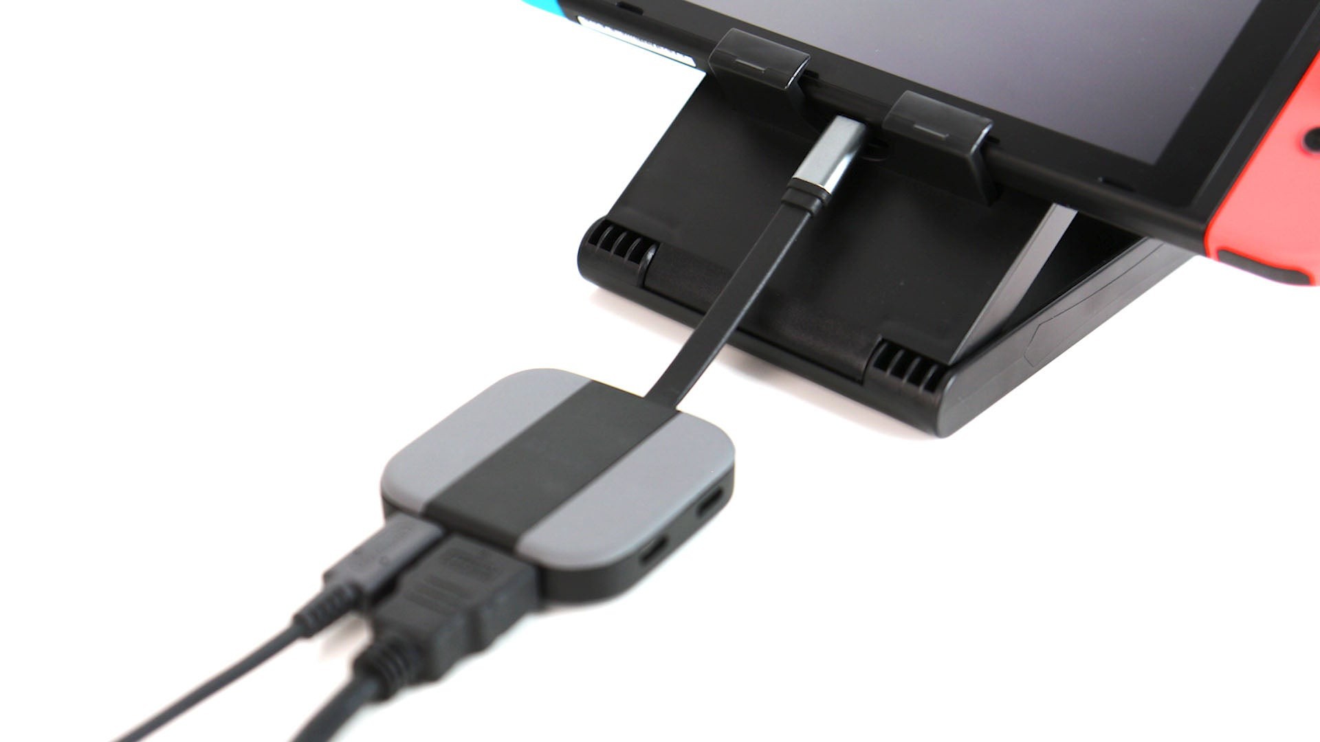 There is a downside to SFANS' approach though. Yes, it costs less and has a host of advantages. But ultimately SFANS is an adapter, not a dock, and that's a key distinction to make. Simply put, there's nowhere to slot the Switch tablet itself, and inevitably, you end up laying it flat on the table next to it - and this isn't conducive to good airflow, as there are two vents on the rear of the unit. To work around this, a stand is clearly required, and this is supplied as part of a pricier SFANS bundle. The stand is an adequate, if basic solution; a plastic frame offering three angles to rest the tablet, factoring in Switch's awkward USB-C placement at the bottom. It does the job, but it starts to add to the bulk when taking the adapter on the go. Collapse the stand down and it's still thinner than travelling with an official dock, but the upgrade is less impressive, and it takes the price-point closer to Nintendo's official solution.