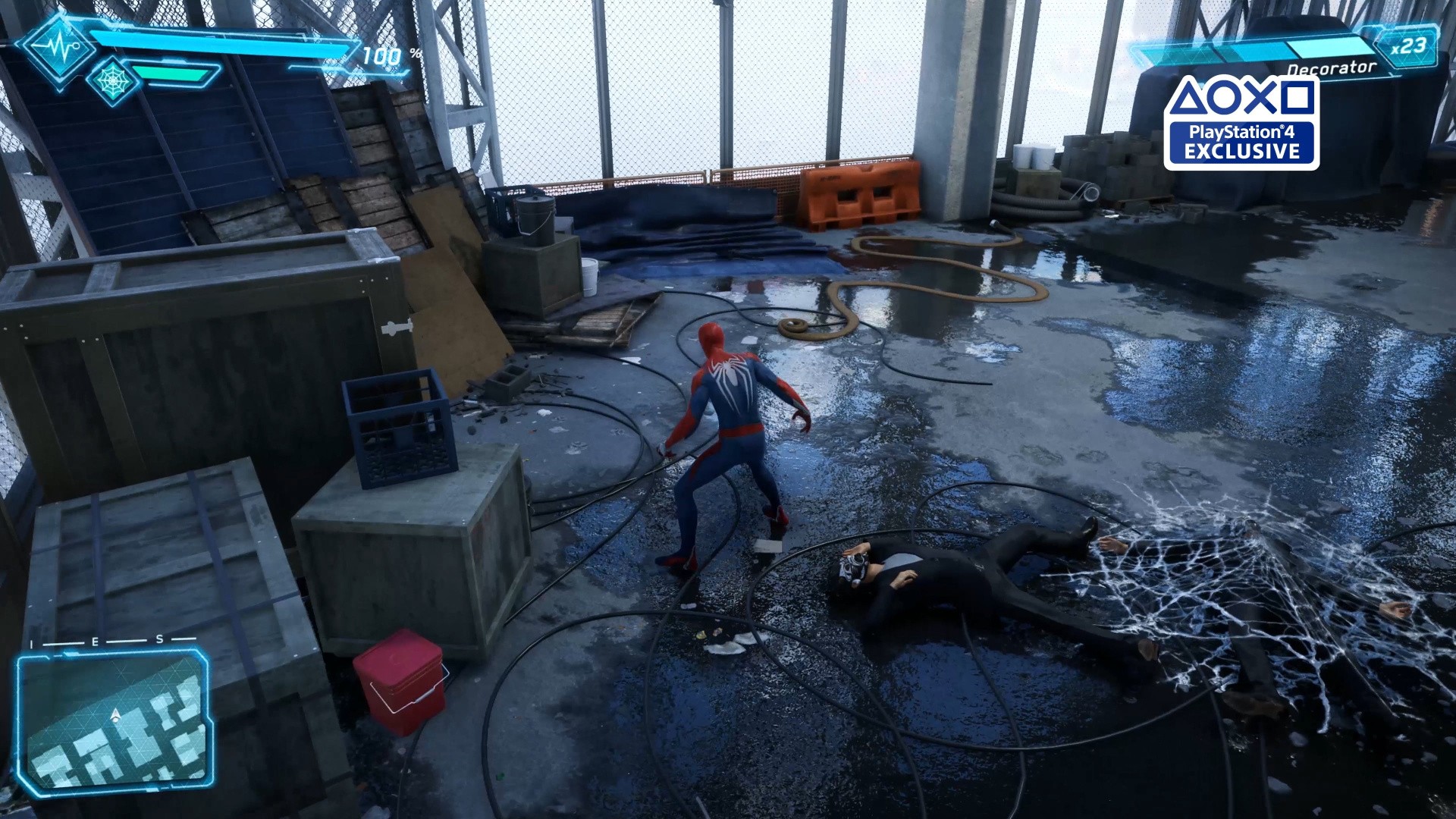 Also worthy of praise in Spider-Man's E3 demo is the quality of animation in the demo and its use in engine-driven cutscenes. Use of animation blending and layering ensures that Spider-Man moves around the environment smoothly when jumping and attacking multiple enemies, and this allows for combat to flow in a more realistic manner compared to past Spider-Man titles. The level of fluidity here enhances the game's many interactive set-pieces, such as Spidey's leaping and sliding through an office building as it is blown apart, or attempting to stop a falling crane from crashing to the ground. In short, the fidelity of the rendering here means that Insomniac doesn't need to rely on pre-rendered video sequences, and there's more continuity between cutscenes, QTEs and gameplay.