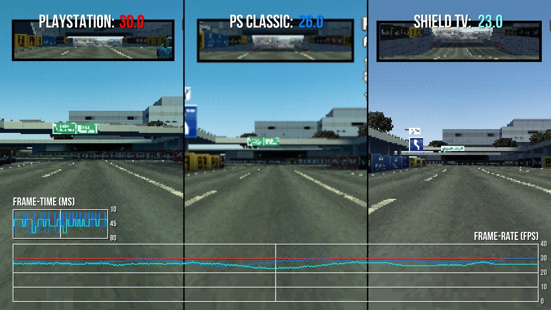 It wouldn't be too bad if the rest of the NTSC games ran properly but sadly, they do not. Ridge Racer Type 4 is one of my favorite games in the collection and on original hardware, it delivers a very steady 30 frames per second. So how does the Classic fare? Well, unfortunately, it's terrible. There are two issues here - firstly, the frame-time isn't consistent even though we're playing an NTSC game. The frame-times bounce between 16ms, 33ms and 50ms constantly. Even worse, there is actual slowdown on the PS Classic that was not present on original hardware. It's remarkably jerky to the point where a lot of the fun is sucked right out. When you couple poor performance with bad sound and blurry image quality, it's not a pretty picture. Another issue I noticed is the game's menu system. It uses interlaced output on original hardware and seems to run incorrectly on the Classic. It's dropping frames and appears choppy in comparison - not a huge deal, mind you, but another strike against the Classic. Once again, PSP, Vita and PlayStation TV deliver an experience nearly identical to original hardware.