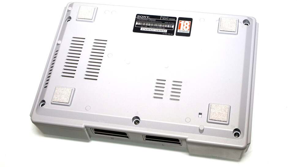 Opening up the PlayStation Classic is a piece of cake. Five screws on the base of the device hold the two halves of the replica casing together. A cross-head Phillips screwdriver is all you need to gain entry to the innards - there are no troublesome Torx screws or glue to contend with. A label on the underside of the machine gives the PlayStation Classic a SCPH-1000R model number, a nod to the original PlayStation's SCPH-1000 designation.