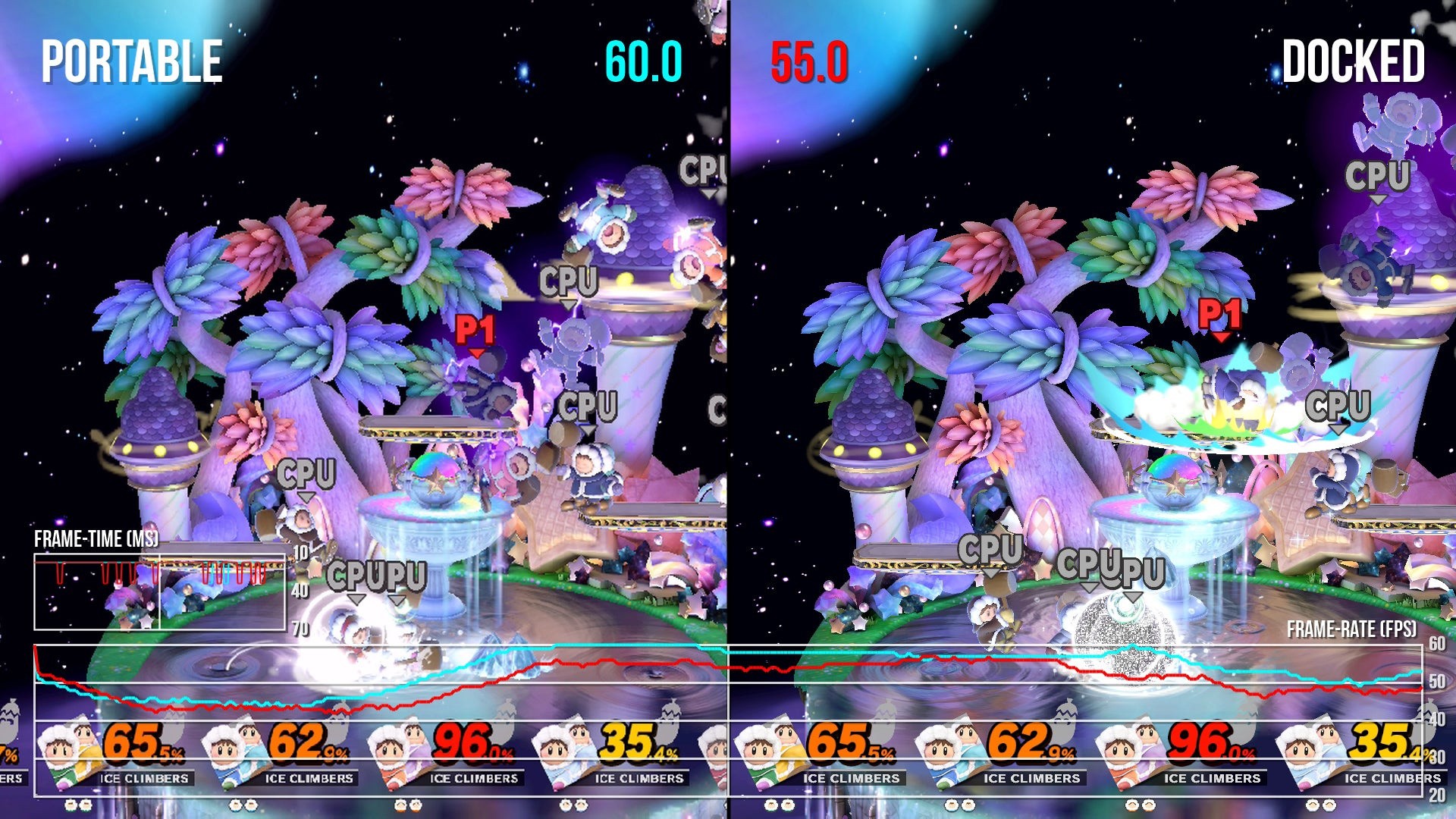 So what's going on? Well, by running the same sequence back in each mode, clearly both struggle. Even so, the cutback in shadows while running Switch as a portable, plus its resolution reduction to 720p, gives it more headroom for stress points. Even factoring in the lower GPU clocks when running Switch away from the dock, it still gives us more wiggle room to cope with taxing situations - if only by a bit. So yes - portable runs marginally smoother. It's not enough to salvage 60fps with all Ice Climbers on-screen, but as a benchmark, it's interesting to see.