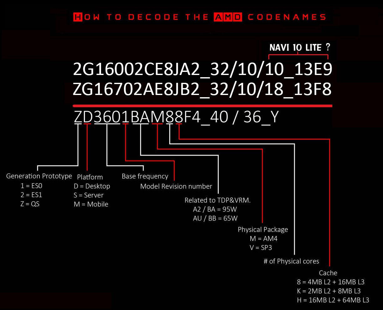 Back in January, Apisak revealed the Gonzalo codename and backed the product code with an image designed to help decode it (I've expanded on it below). It's based on examination of existing AMD chips and as Gonzalo has elements that don't match any existing chip, some aspects of the code such as cache configuration can't be ascertained. But what it tells us is that it's an engineering sample for a product designed for a games machine (the second digit - G - would be a D for a desktop APU) featuring eight CPU cores with a 1.6GHz base clock and a 3.2GHz boost clock. At the end of the code is a PCI identifier for the GPU, previously identified on the Chiphell forum as Navi Lite - which by extension, all but confirms that it's a 7nm design. A disappointment seems to be a GPU base/boost clock speed locked to just 1.0GHz.
