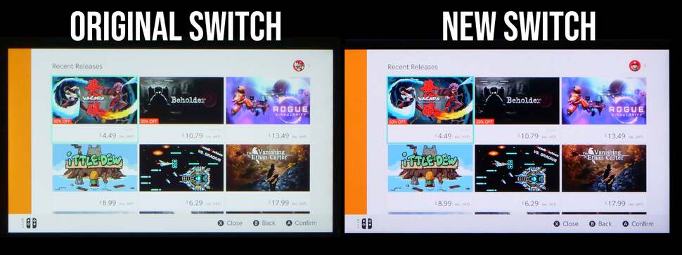 Thus far, the story is pretty straightforward. It's the same Switch with a new processor, meaning efficiency and battery life gains but not a whole lot more. However, there are a couple of curve balls. First of all, the display has indeed changed. The Wall Street Journal has reported on a deal for Sharp to provide its IGZO display technology for Switch, but it's unclear if that's for the Lite model or this one too. What I can say is that side by side, the difference between my old model and the new is stark. While there is a slight cyan/yellow tint to my existing Switch, white is generally white. Meanwhile, on the new model, the magenta tint is more noticeable.