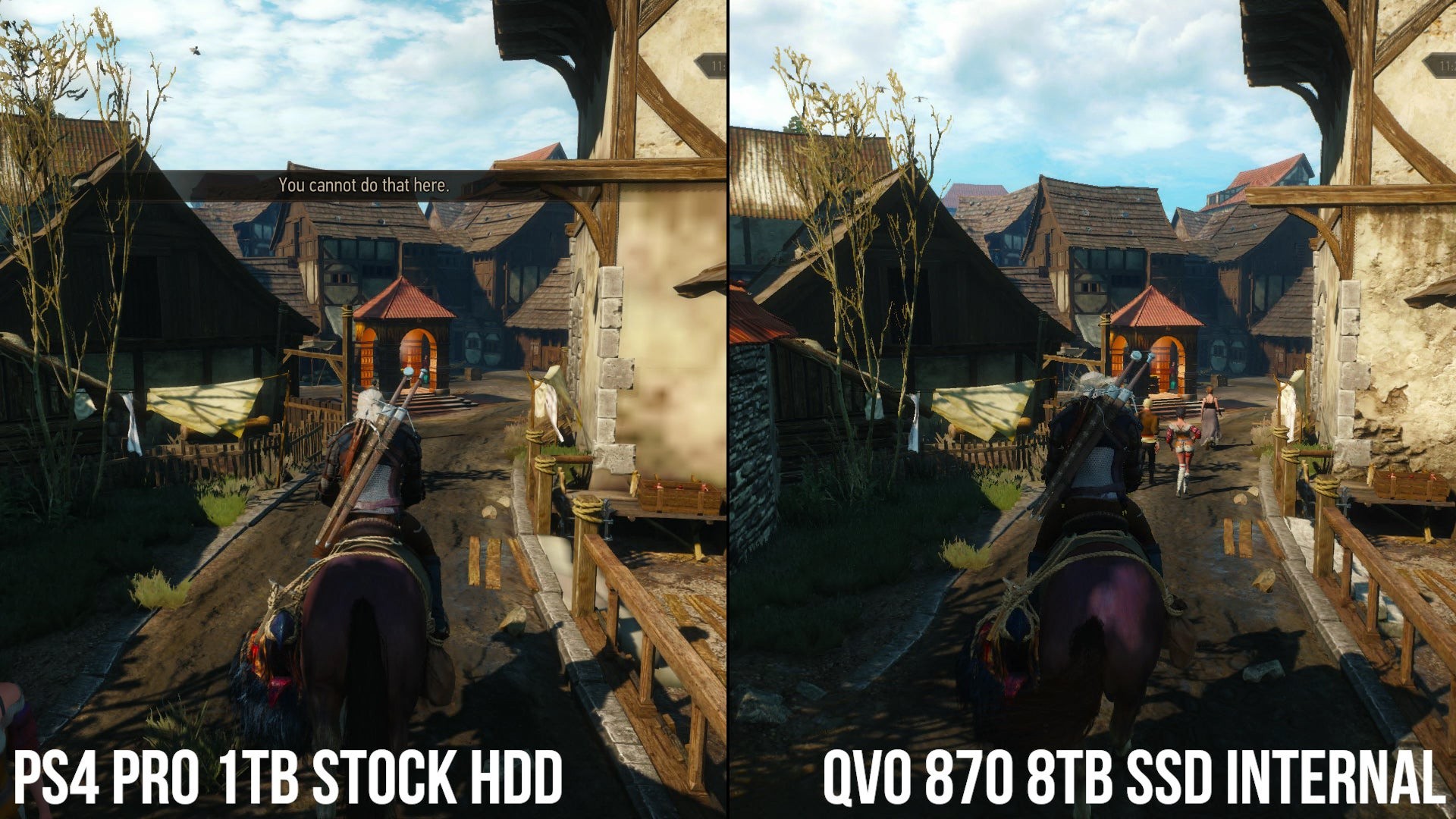 Tests at the time of review were inconclusive, but a more detailed look with the QVO 870 does seem to show clear and dramatic boost to texture loading and even a noticeable upgrade in geometry pop-in. There's also a good improvement in The Witcher 3's more challenging areas too. Galloping from the outskirts of the Novigrad region to the inner city, this run is a perfect stress test for a stock PS4 Pro drive versus an SSD. Again, there's an undeniable upgrade here. Much like Final Fantasy 7 Remake, textures on building sides can't load in time on the stock PS4 Pro HDD, leaving a blurry mess on the first run, with no problem at all on SSD. There are no improvements to geometry pop-in, however.