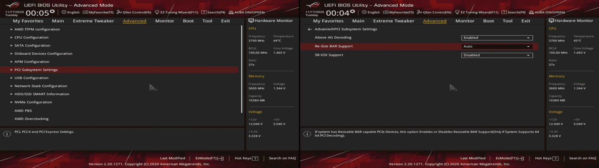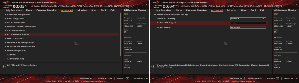 Once you've ensured you meet the requirements, you'll need to head over to your BIOS. (I like to get there by holding Shift while clicking Restart in Windows, then selecting Troubleshoot > UEFI Firmware Settings, but hammering Delete or F2 after a regular restart works too.) From here, each board is different, but on our Asus board we needed to visit the 'Advanced' tab, enter 'PCI Subsystem Settings', then enable 'Above 4G Decoding'. This unlocks a new option, 'Re-Size BAR Support', which when set to Auto with a compatible graphics card will activate SAM.