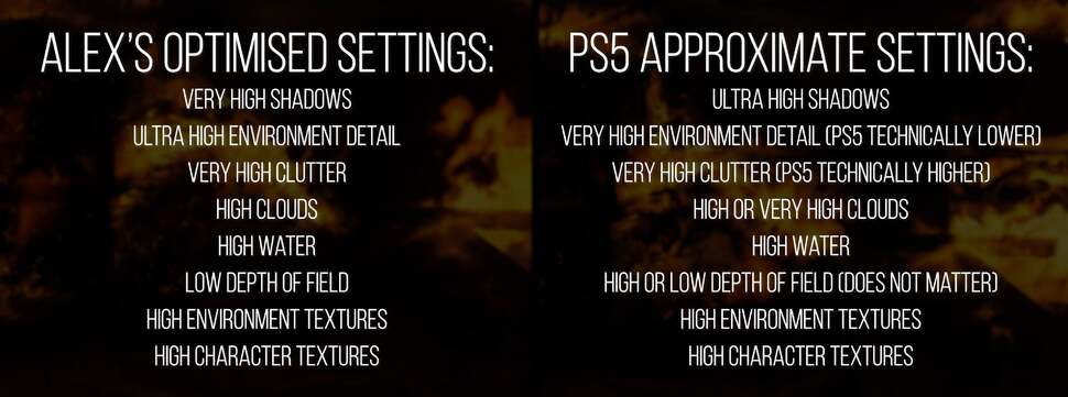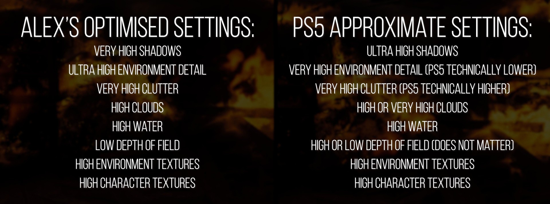 There are other inconsistencies too. For one, all the cloth physics in the game run at a sub-native frame-rate on PlayStation 5: 30fps or even lower. On highest PC settings, you'll get full native frame-rate, and you only get something similar if adjust the environmental detail setting down to medium. So essentially, we lack the granularity in the settings to get an exact console to PC match across the board. Also there doesn't seem to be an exact match in the quality of fire rendering which appears to run at full resolution on PC, but much lower on PS5. But with that said, there are still some intriguing comparisons and conclusions we can draw.