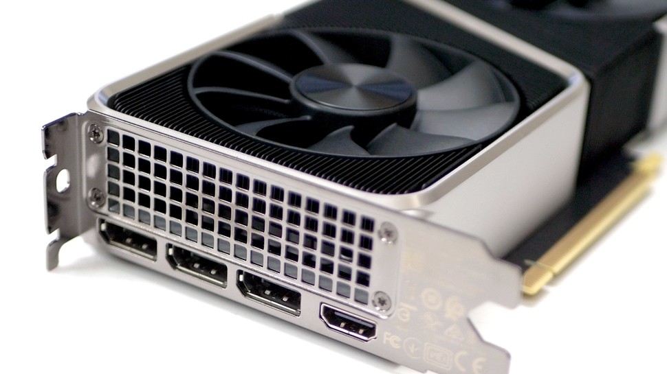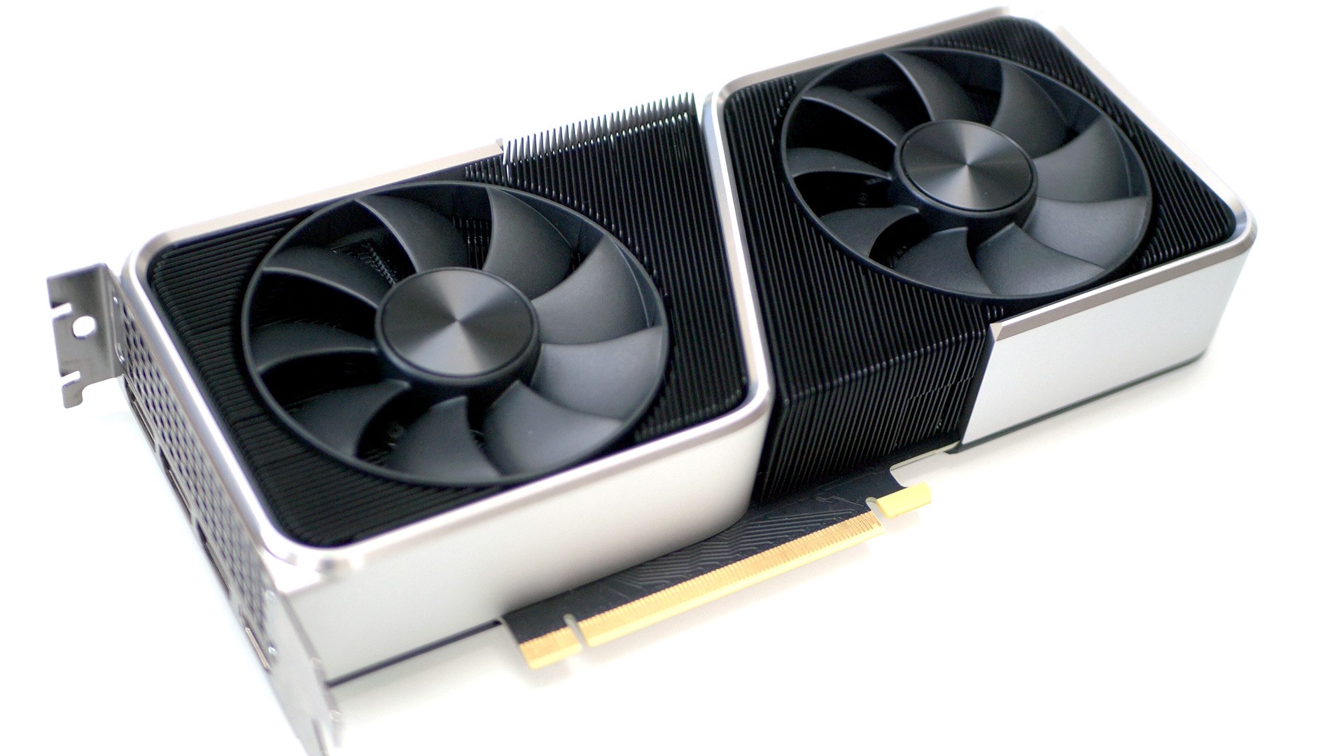 As usual, we're testing the Founders Edition of the card, which comes with the same gorgeous industrial design and in the same compact dimensions as the RTX 3070. We have two axial fans in a 'flow-through' configuration, with the small, pennant-shaped motherboard design and miniature 12-pin power connector allowing the final third of the card to be wholly used for cooling. Even the I/O is arranged to maximise airflow, with a single row of display outputs (three DisplayPort 1.4, one HDMI 2.1) sitting beneath a 16x5 grid of ventilation cutouts.