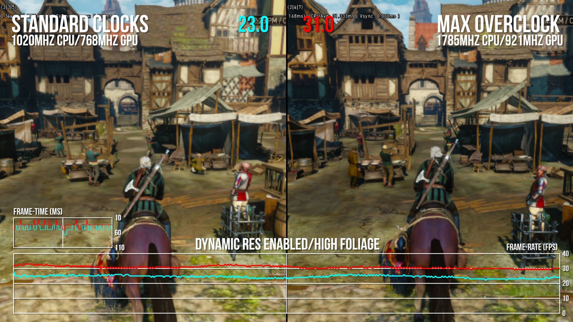 Is the overclock providing a free lunch then - a better experience with no drawbacks? Well, the improvement is palpable but it does come at a cost. Regardless of the system clock speeds, The Witcher 3 is a challenging game built around dynamic resolution for a reason - it's really heavy on effects and the system really does need some level of scalability in its pixel-pushing. In most cases it's fine, but honestly, forcing the max pixel count is a recipe for disaster if you want to hold 30fps in spots like Crookback Bog. Frame-rate can drop to the low 20s at that point, a performance level lower than the stock experience.