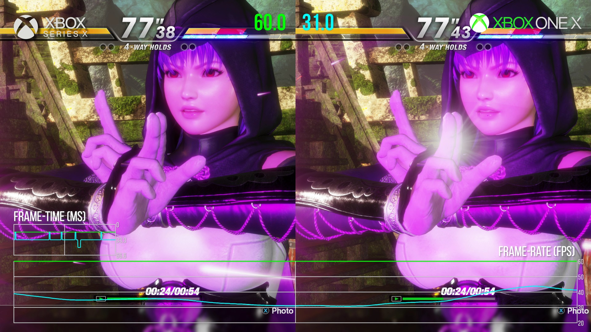 Another eye-opening example of sheer GPU brute force comes from Dead of Alive 6. Its 4K graphics mode performs terribly on Xbox One X - operating mostly in the mid-30s. It's precisely what you don't want from a precision fighting game, and so the only real choice is to drop back to a lower resolution mode, even on the what is still currently the most powerful games console on the market. I used matched replays to compare One X and Series X. In all three of my test scenarios, Series X hit full frame-rate.