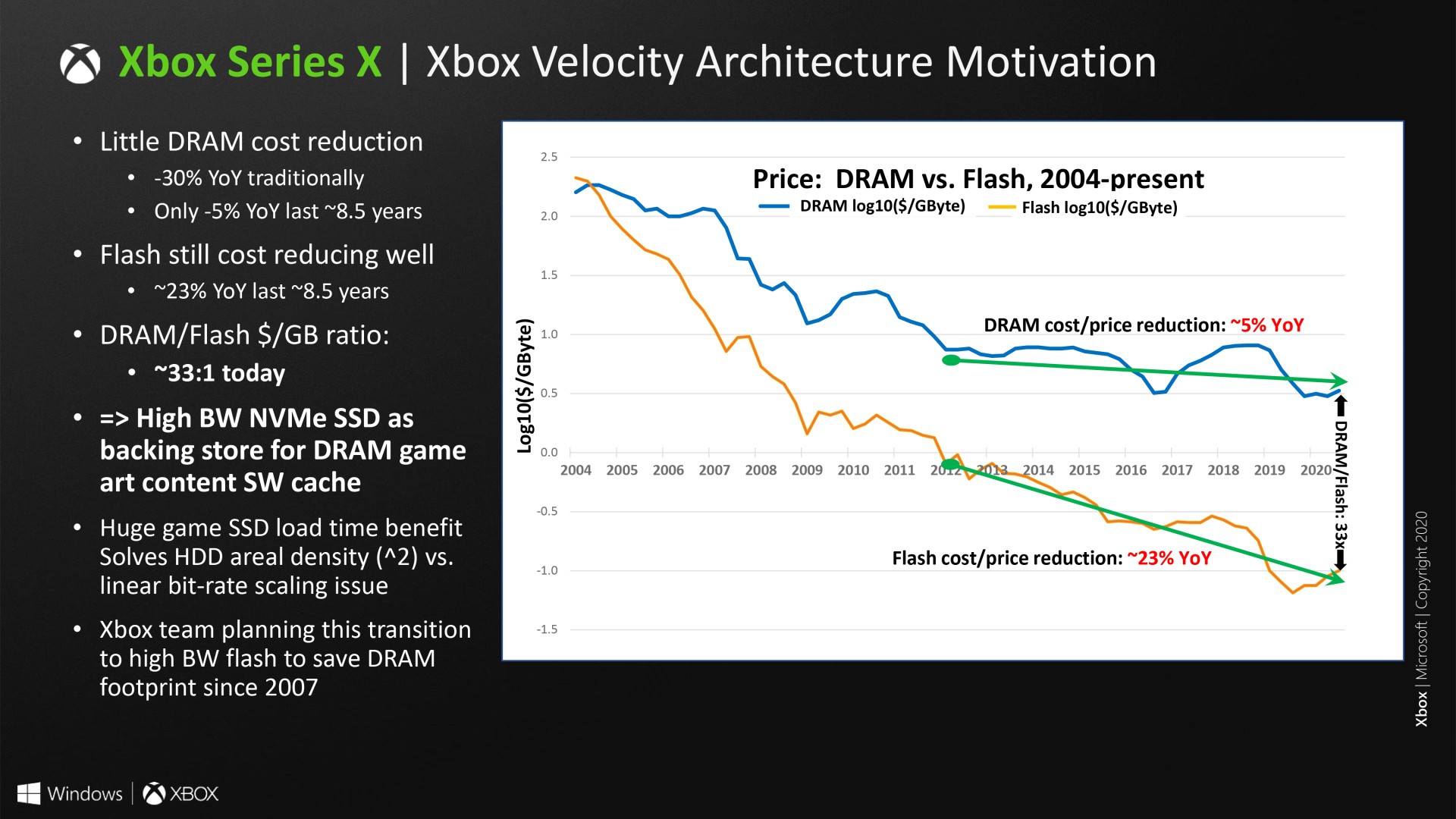 The basic idea is fairly simple: texture maps are stored at different quality - or mip - levels. The size of texture data is ballooning already as we transition into the 4K resolution era, so the idea is simply to stream in the portions of texture data that are actually required, delivering what Microsoft says is anything up to a 2.5x multiplier to memory. It's part of Microsoft's Velocity Architecture, which seeks to maximise Microsoft's investment in solid state storage. There, at least, the economics look more positive. While there is an initial hit in transitioning from hard drive to SSD, the year-on-year cost reduction with flash NAND looks positive - Microsoft says it's in the order of 23 per cent. While it's potentially a way to cut prices over time, it may well be the case that it'll open the door to higher capacity console SKUs that don't cost the earth.