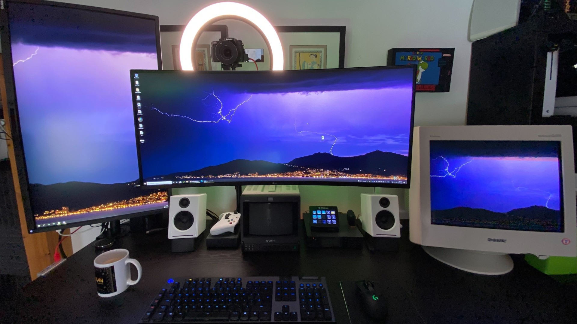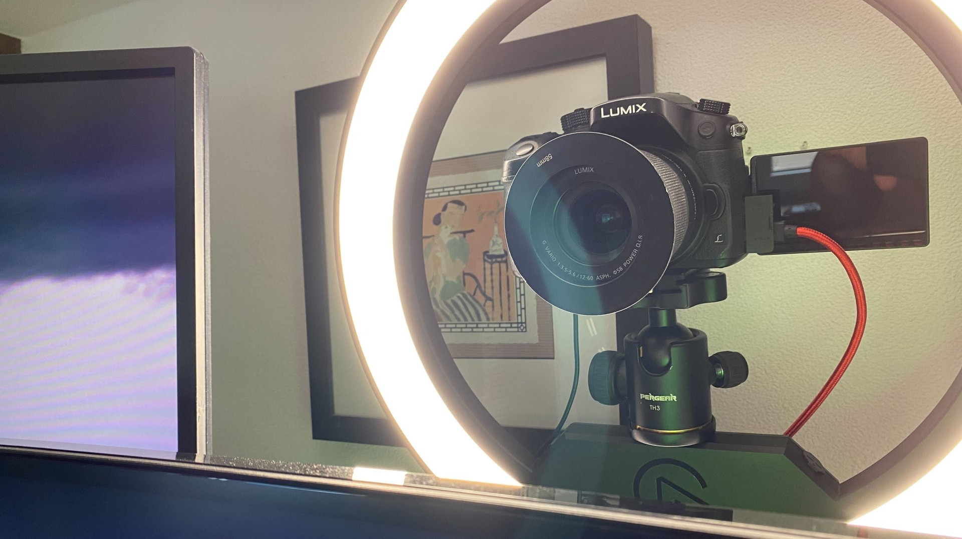 The primary mount, however, is attached to the back of my desk behind my monitors. The monitor, by the way, uses an Ergotron HX monitor mount allowing me to swing this large 38-inch ultra-wide screen around my workspace. The Master Mount holds the Panasonic camera but this is mounted on top of a Ring Light from Elgato. This circular light is massive - using a ring of OSRAM LED lights with a light diffuser covering the entirety of the front lighting area, it allows me to instantly light the scene around my desk. On its own, it provides a solid amount of light for typical on-camera filming - something you can see in every episode of DF Direct Weekly. The challenge, of course, stems from the room itself - it's difficult to deal with a window directly behind your desk, for instance but I think it gets the job done without creating harsh shadows. I've been thinking of adding additional key lights to further boost levels but the Ring Light works pretty well on its own. Rich Leadbetter, Alex Battaglia and now Tom Morgan also use Panasonic cameras mounted within Elgato Ring Lights.