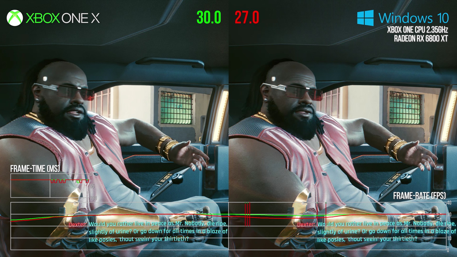 As you'll see in the video, our Xbox One-powered PC could run at 4K 30fps with no graphics-related performance drops. Xbox One X uses dynamic resolution scaling to ease the GPU load, but in areas where the PC outperformed Xbox One X, it does suggest that there are still some momentary graphics bottlenecks on the console. But what is more fascinating is that in most cases, where our Jaguar-powered PC dropped from 30fps, Xbox One would drop too. This suggests that it really is the CPU and the demands placed on it that are the heart of the problem facing Cyberpunk 2077 running smoothly on last-gen machines. It's been suggested that storage is also an issue, but running from SSD on both systems would eliminate that from this specific testing. Another takeaway from the analysis is that where Xbox One X drops, there's a strong likelihood of PC dropping harder - remember that the consoles get far more efficient APIs while the fixed hardware allows developers to target it specifically. On top of that, the hacked-up PCI Express interface we do have on the PC side is still a potential bottleneck, and may amplify the performance drops seen in traversal. Overcoming the split memory set-up on PC is also likely to have a significant overhead.