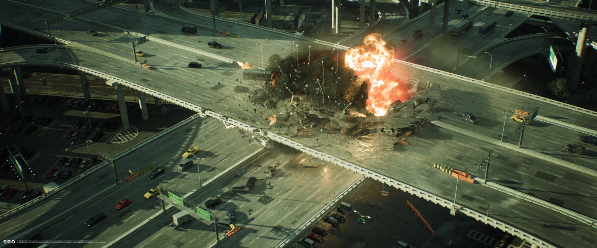 Similarly, there's no major requirements for staging enormous set-pieces. The cars flipping during the shoot-out sequence is achieved simply through simulating a push through the Chaos physics system - "and off it goes," says Michal Valient. "Yeah, none of those reactions are scripted," adds Jeff Farris. "You shoot a tyre, we give it a little kick in physics and it just goes through."
