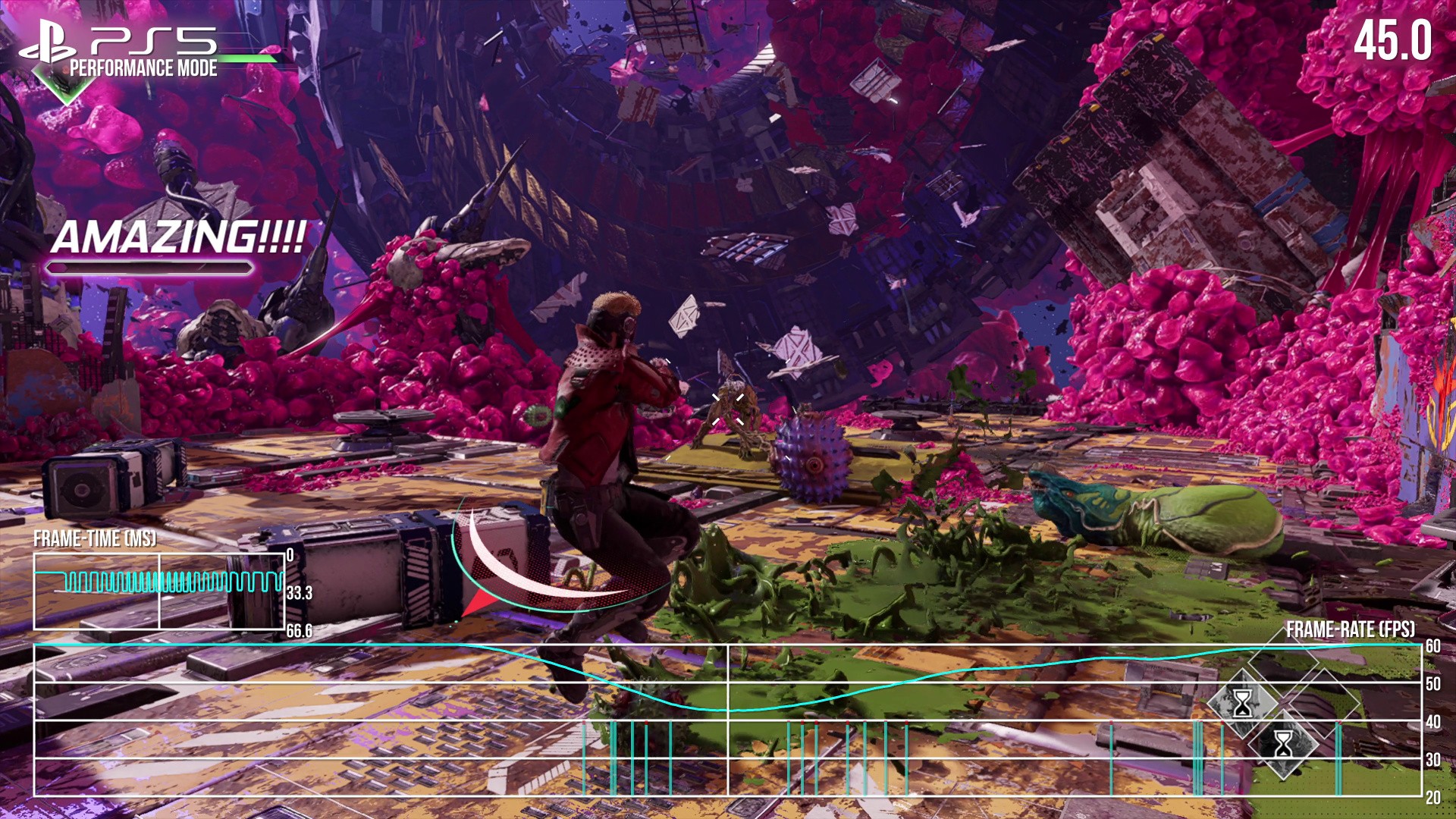 First off, I really want to stress that Guardians of the Galaxy is a genuine surprise, an exceptional game and a visual tour-de-force. It often looks stunning - and that starts with the locations. The Quarantine Zone, a planet of derelict machinery fused with a pink crystalline gel, is a perfect backdrop for the Guardians' first mission. Materials come out beautifully in the midday sun. Light shafts seep from behind pillars of dense scrapyard tech, giving the world a rich, opulent look. Lighting also brings out the sharp, specular layer on the pink rubble, a lot of which is destructible. All round, there's a heavy art-driven approach to each area and every set-piece. Later planets have wildly different biomes, of course. The second mission puts us under rainy, scorched skies, for example, while wind physics affect foliage. It's a battle against the elements as we hop between moss-covered islands - where again, material work is stand-out.