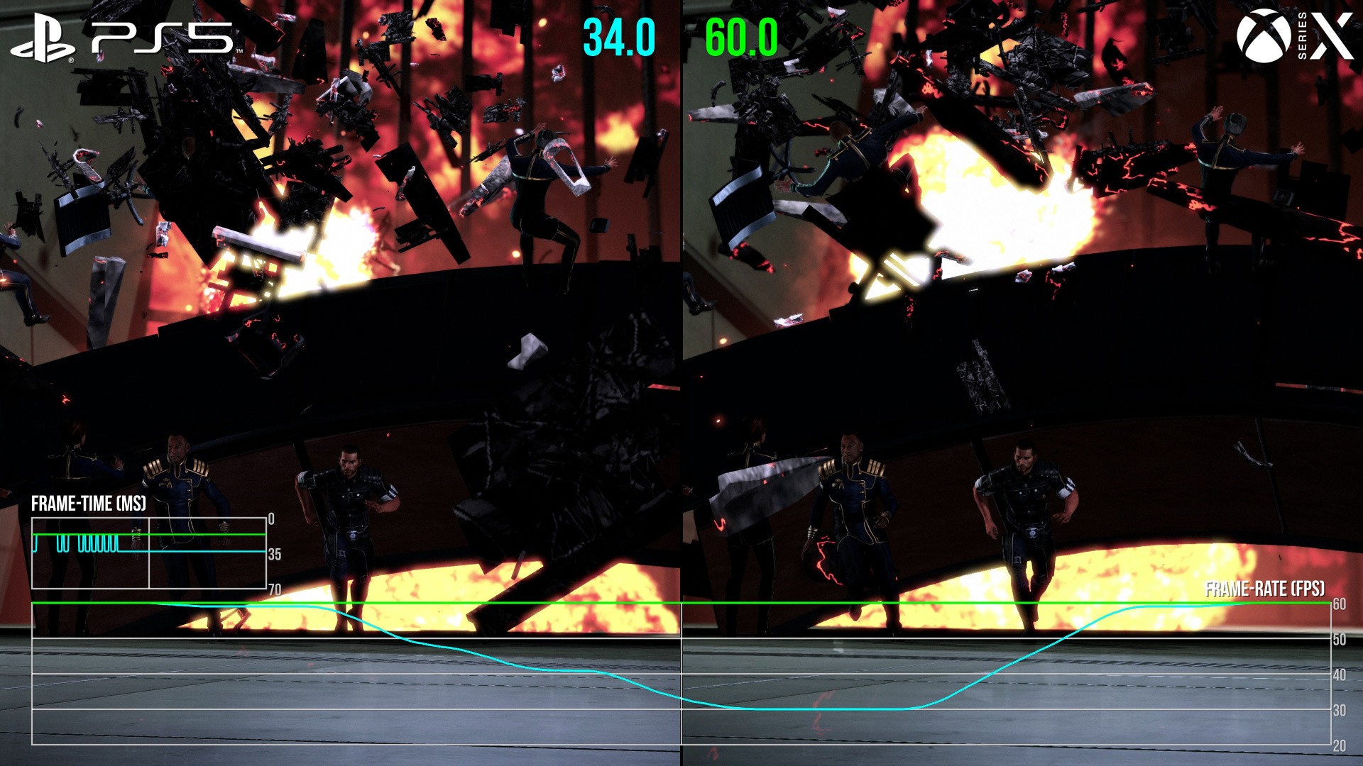 Before we go in-depth on performance, it's worth noting that the sheer size of the Mass Effect trilogy included, spread across three consoles and two quality modes, means that our samples are necessarily limited to the opening few hours of each title. We'll start off with the quality mode where Series X is the strongest 4K60 performer of on console, with no dips under 60fps whatsoever. PlayStation 5 has some minor frame-rate dips and seems to struggle more with screen-filling transparency effects - the big explosive cutscene at the beginning of Mass Effect 3 being a good stress test. Meanwhile, Series S mostly sticks to its 4K30 target - however, again, taxing transparency effects can see performance tumble to the low 20s at its nadir. Dynamic resolution scaling is included too. Native 4K does seem to be the norm in most test samples on PS5 and Series X, but a 1944p pixel count did manifest in one area of our testing. Owing to the nature of DRS, further drops cannot be ruled out.