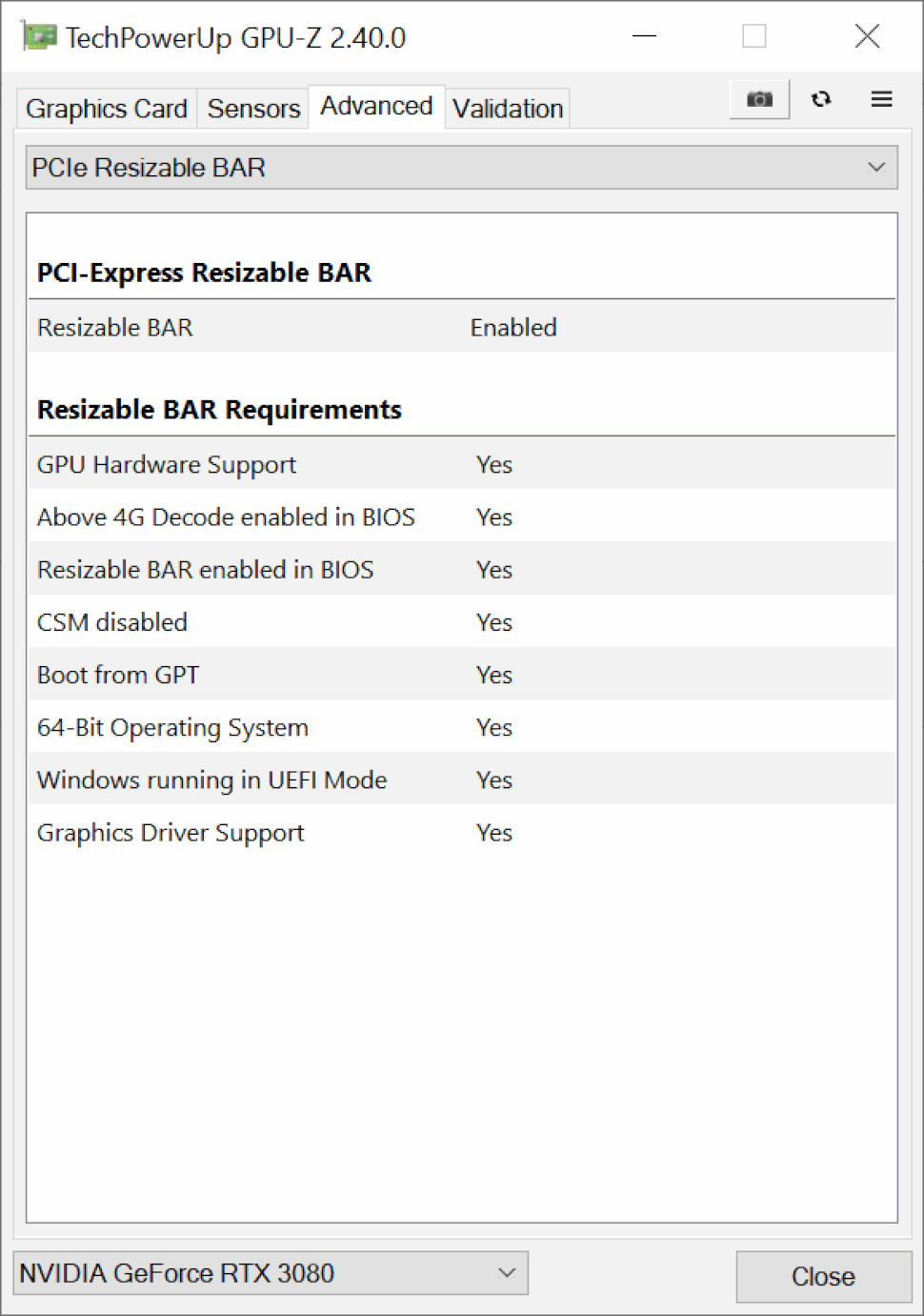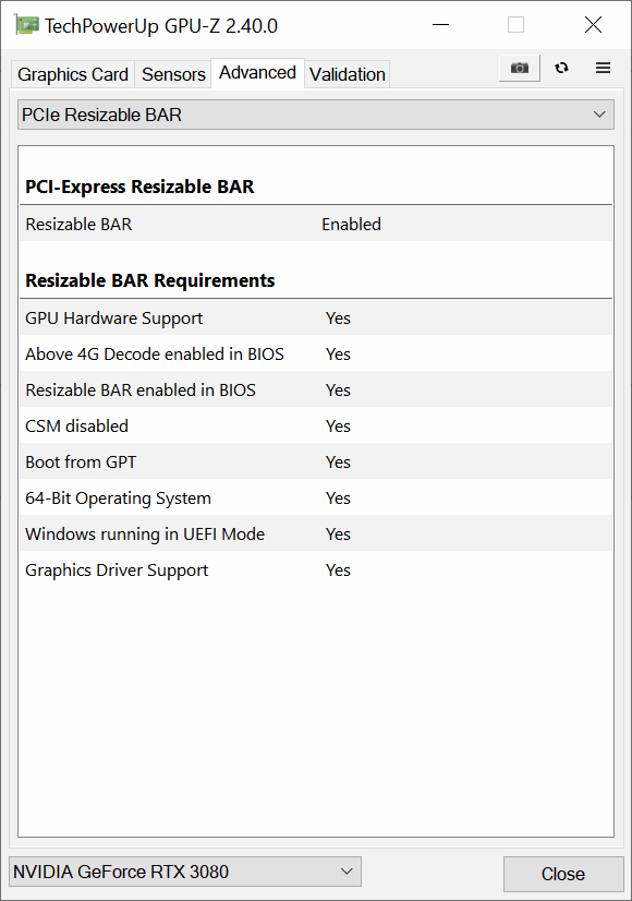 Pro tip: You may find it helpful to install GPU-Z 2.40.00 or later, as the tool now includes a special Resizable BAR window that shows whether the feature is active and, if not, which requirements you're not currently fulfilling. To see this, just click on the Resizable BAR readout on the main screen of the application or navigate to the Advanced tab then select PCIe Resizable BAR from the dropdown at the top.