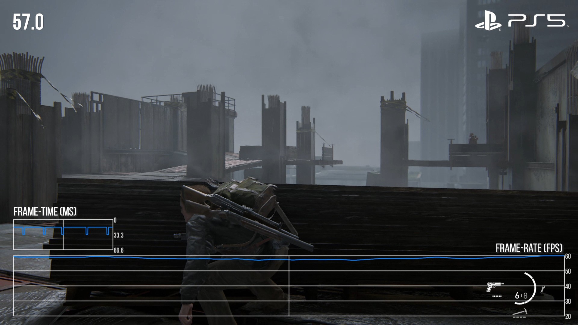 Check out the screenshot below. In this battle sequence set on top of an abandoned skyscraper, in one specific area and engaging enemies, a drop in performance found on PlayStation 4 Pro also manages to bring about a small, but sustained frame-rate dip on PS5. It's the only example of a performance blip I could find on PS5. It's a little puzzling because it's not entirely clear what's going on. This is a cool sequence but it's certainly not as visually taxing as many other areas in the game, nor is it as large in scope. It's just this building site shrouded in fog. This is nothing more than an academic finding, as it seems to the only sequence that doesn't doggedly adhere to 60fps and even then, it only occurs in that specific position.