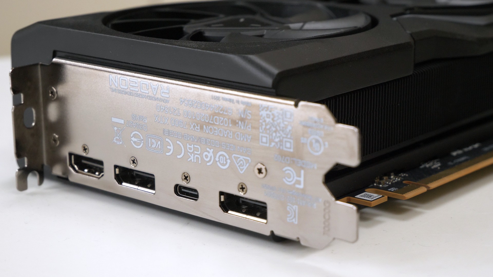 Video outputs are absolutely fine too: we're looking at two of those desirable DisplayPort 2.1 sockets, paired with a single HDMI 2.1 port and a USB-C output. The latter option there also supports full DisplayPort 2.1 bandwidth, by the way. This is a decent collection of options here, but I do wish that the small USB-C port was provided in addition to a third DisplayPort, as we saw on Nvidia's reference RTX 2000 cards (unfortunately, GeForce cards cut USB-C in the last generation).
