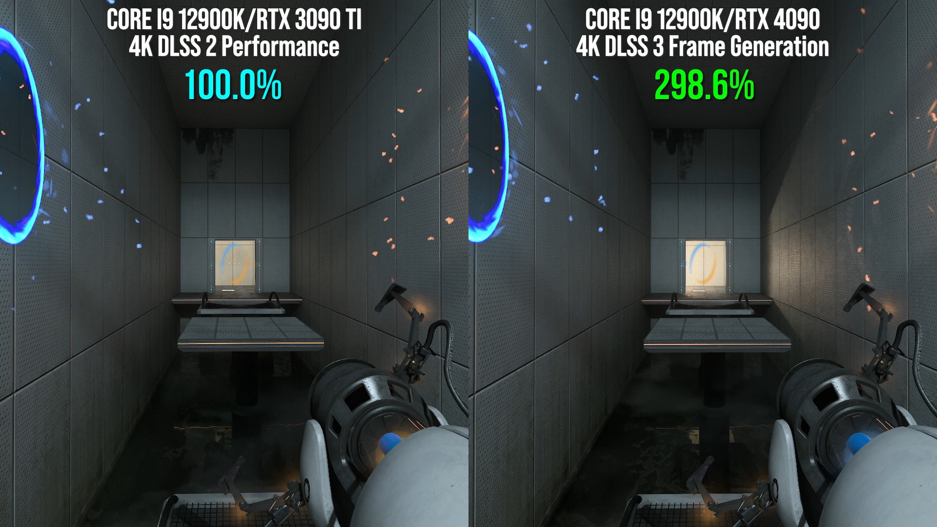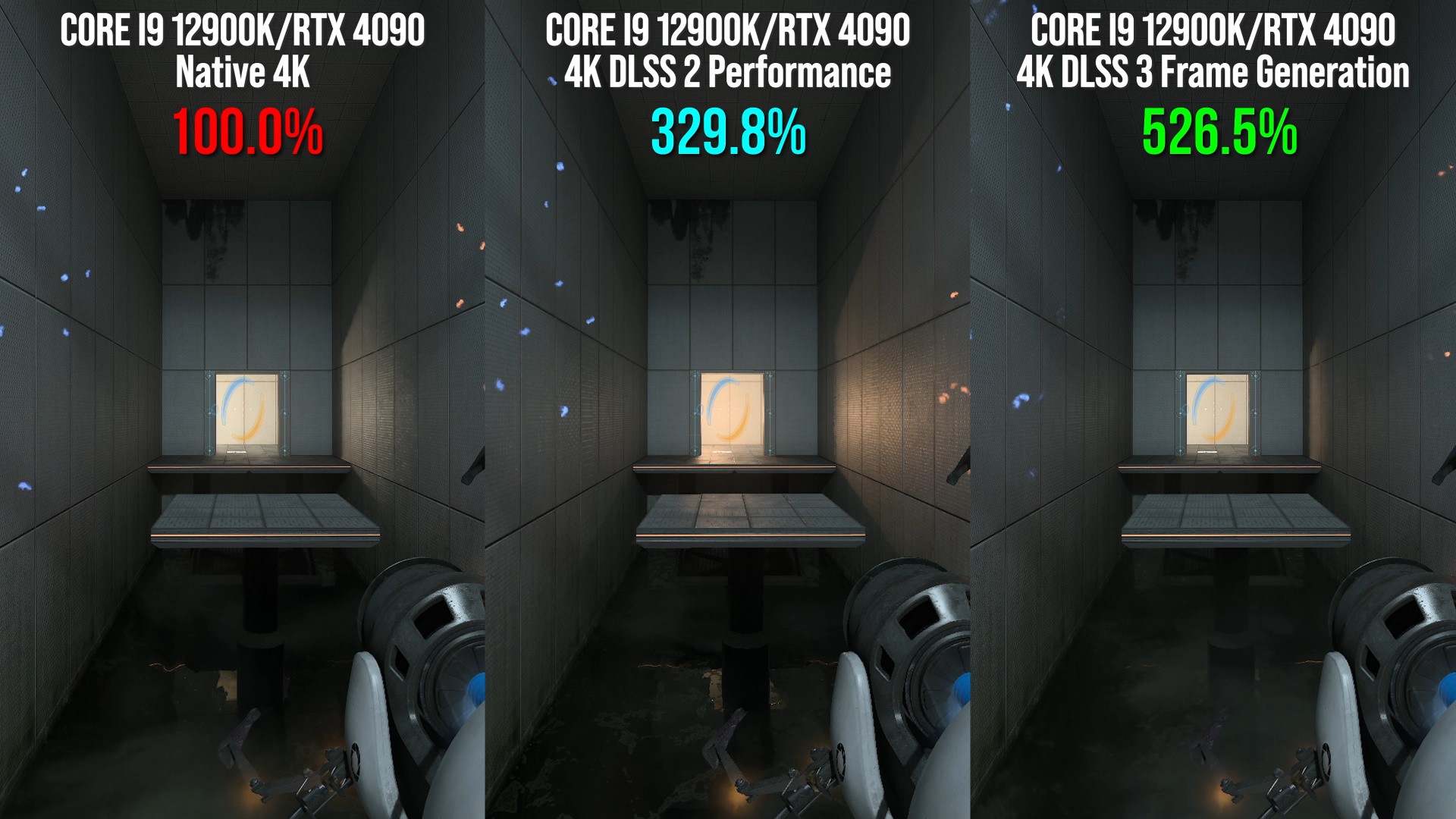 Looking at Portal RTX first, the image there is from a static scene where I engineered the highest GPU load I could muster from Test Chamber 14. This has water in full view, along with two portals facing one another. DLSS 2 on Ampere vs DLSS 3 on Ada Lovelace essentially provides a three-times increase to performance overall. It is game-changing in that at the most basic level, a good experience on a 4K 60Hz variable refresh rate screen runs close to flawlessly on a 4K 120Hz display.