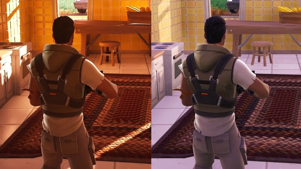 In Fortnite, the dynamic time of day means that the sun's position is changing as you play, so faking realistic light and shadows is more challenging and the difference between the previous prec-calculated solution and RT can be stunning. In the new system, sunlight pours in through windows, transferring colour to nearby surfaces, while natural contact shadows form around objects.