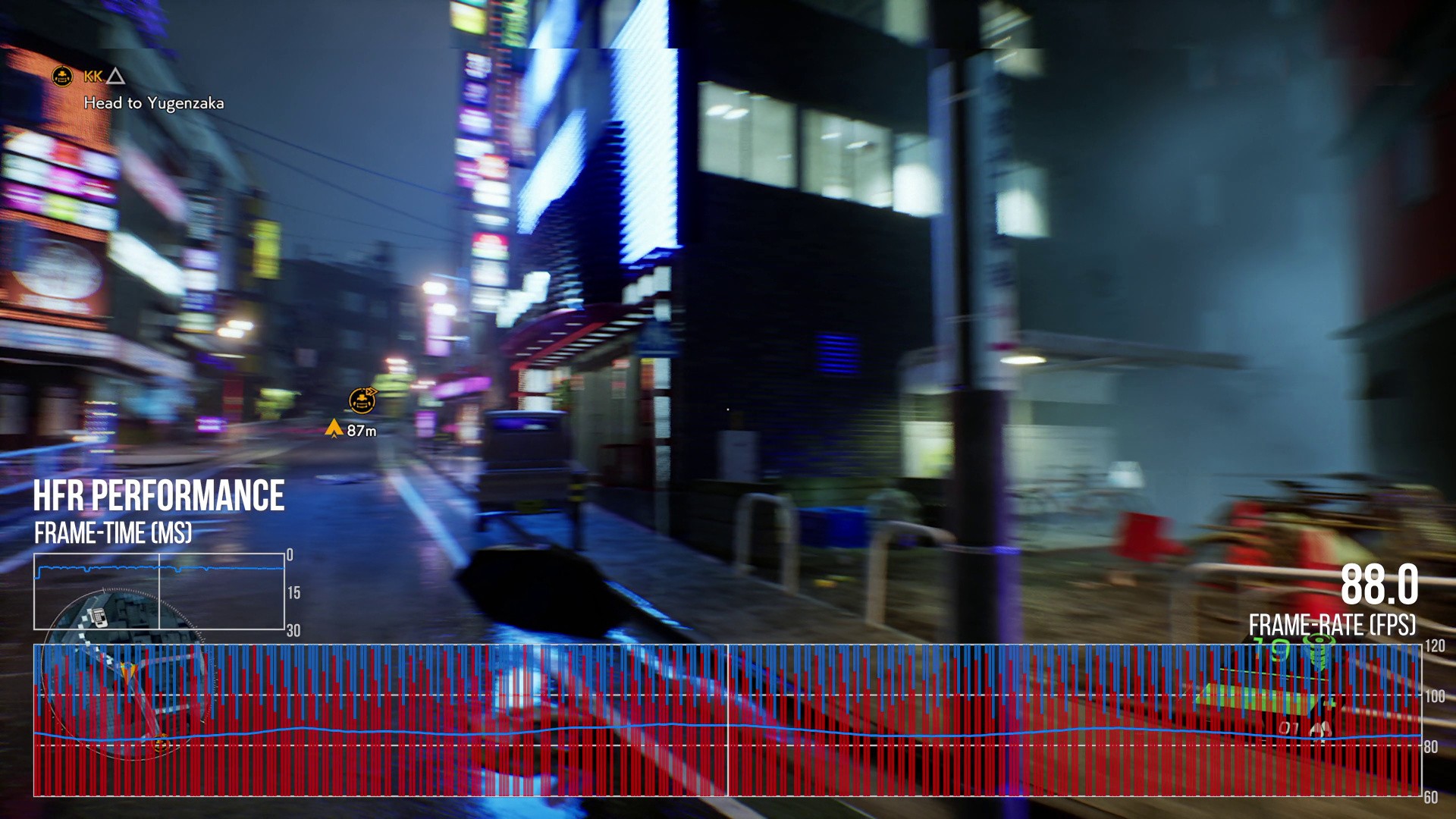 Two modes down, four/eight to go! HFR is primarily designed for 120Hz displays, unlocking frame-rate to allow the game to run faster than 60fps. HFR quality mode retains hardware RT support, operates at what looks like 1080p resolution and seems to hover around 60-70fps but can dip beneath. HFR performance mode keeps the same resolution, but removes RT, meaning that frame-rates are typically north of 60fps in all but the most exceptional circumstances. Both HFR modes have the choice of v-sync on or off: the former lowers overall performance, the latter increases it at the expense of truly hideous screen-tearing.