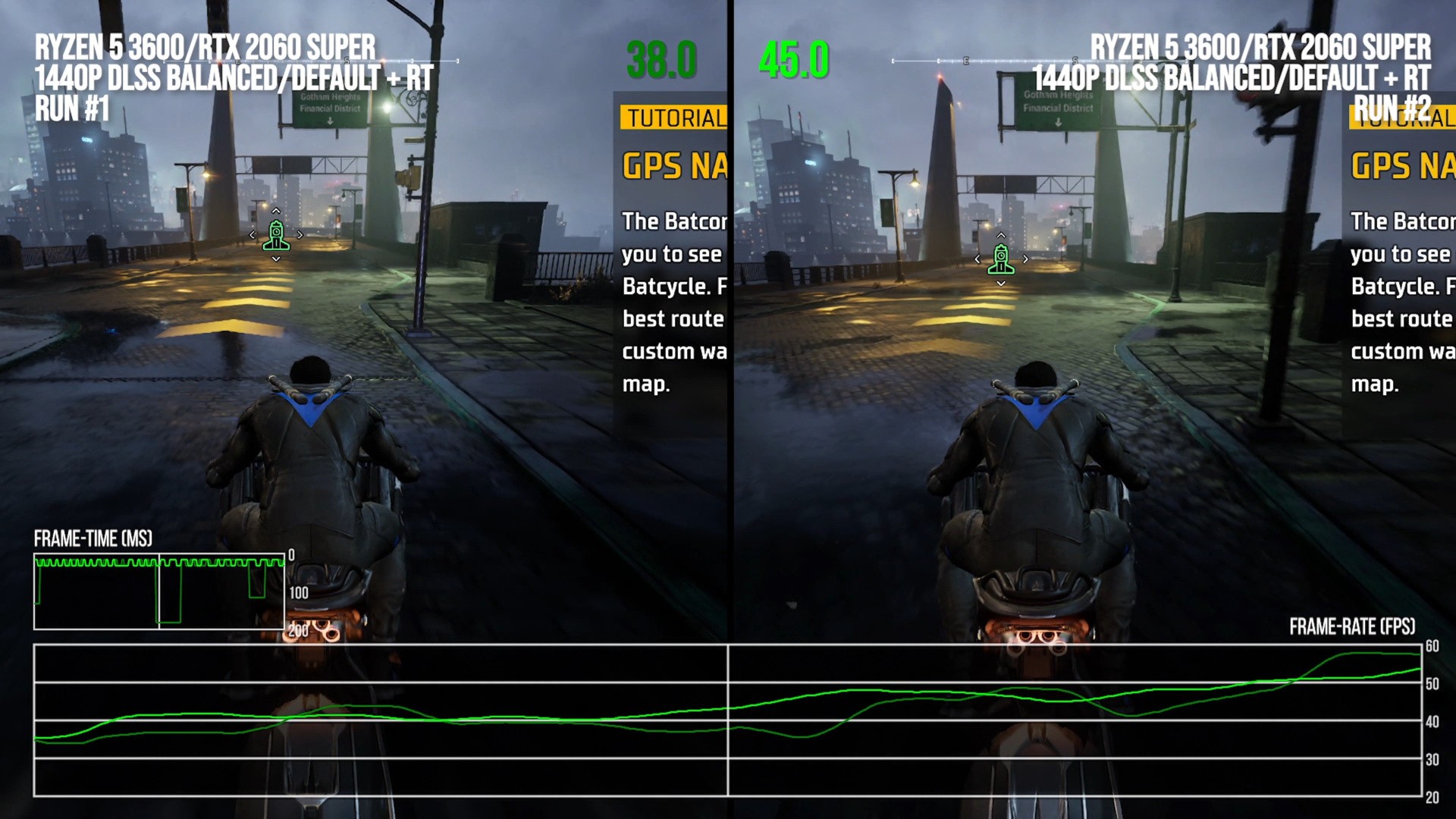 Even factoring out compilation stutter, you're still CPU-limited in Gotham Knights for the vast majority of play - and it's most keenly felt in traversal with the Batcycle, where the game sees performance on the Ryzen 5 3600 drop from near-60fps at moments down into the 20s at its worst, with high frame-time spikes which present like a stutter when they happen. We're fairly certain that the consoles are similarly CPU-limited because when we lock in a 30fps cap on our Ryzen 5 3600 machine, in-game hitching on PC is a very, very close match to PlayStation 5 with often equal frame-rates.