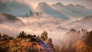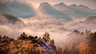 Guerrilla also deserves kudos for the sheer variety in the game, with Forbidden West featuring a wide range of biomes to explore from snowcapped mountains to thick jungles, wide-open deserts, redwood forests and more. There's a real sense that each region within this world has its own unique look and feel. Beyond the sweeping vistas, the micro-level detail is also phenomenal, right down to individual flowers. It's one thing to look closely at vegetation but it's another to interact with it. In the original game, most of the foliage fails to react to Aloy's movements - you'll clip right through it with zero animation outside of very specific plants such as the tall grass you use to hide from enemies. In the sequel, all vegetation reacts to your movement - and that of other creatures too. In fact, surface interaction is one of the biggest areas of improvement across the board - grass, snow and sand all move or deform based on both your movement and the movement of other entities in the world.