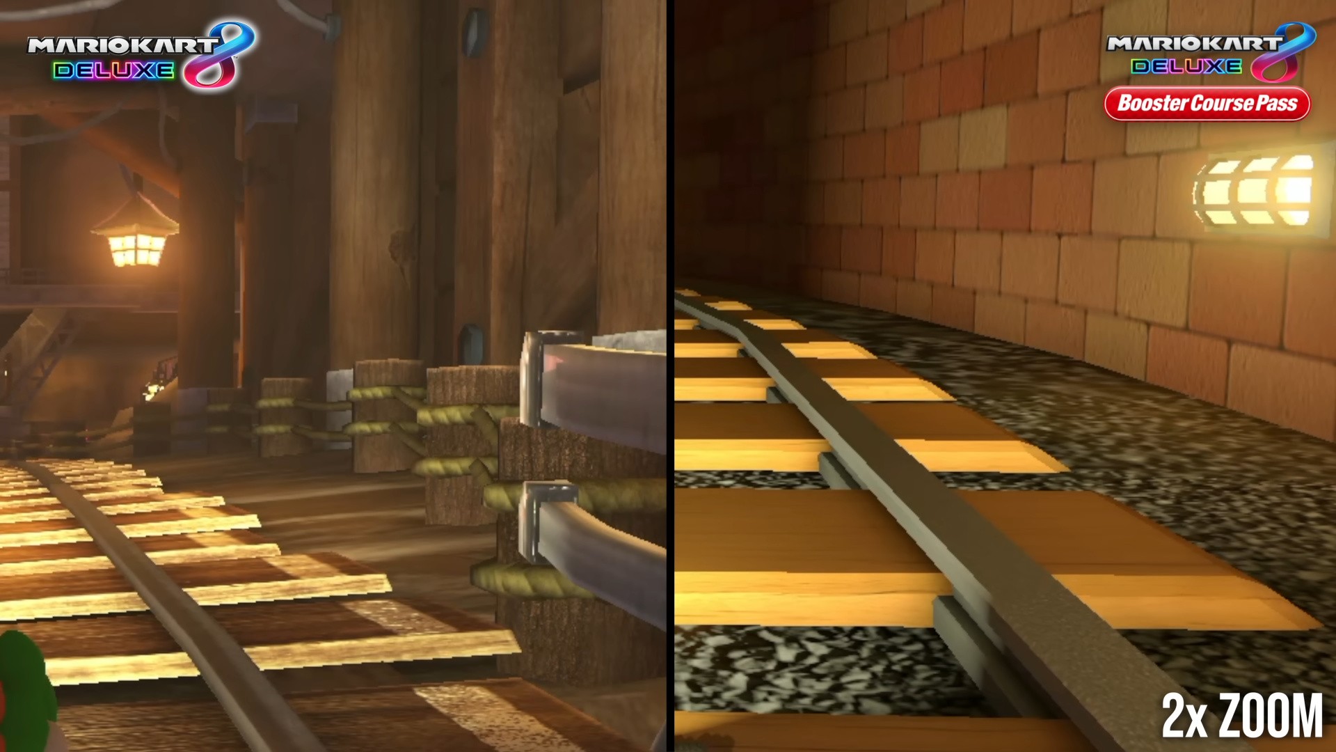 Model geometry is also handled very differently between the two groups of tracks. While Mario Kart 8 had to keep its polygon budget in check to keep performance high, Nintendo managed to craft some intricate-looking trackside flourishes. Interior spaces in particular were a real treat, with enough geometric detail and texturing tricks to convincingly realise Nintendo's artistic visions. The Booster Courses look much simpler. Trackside buildings, for instance, look flat, boxy, and visibly low-poly. There are plenty of egregious-looking boxes, tubes, and other small trackside details that lack the nicely-rounded appearance of geometry from the base game. Moreover, the intricate modeling featured in Mario Kart 8 is essentially absent, with far simpler and more generic artwork and fewer complex structures.