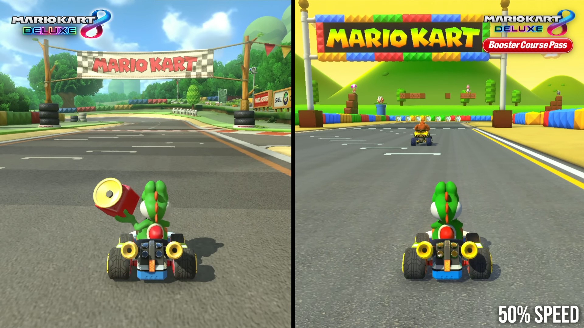 To start with, the textures look completely different. The Booster Course tracks have flat, low-detail textures in general, particularly on trackside geometry and foliage. The new tracks have a clay-like appearance as a result, with minimal surface detail in most areas. If you get close to certain materials, you'll notice some grime and roughness has been blended in with overlaid detail textures - textures that contain repeated high-frequency detail. Depending on the lighting conditions, this can look okay, though it doesn't match the look of the original tracks at all. Most of the time however, objects look almost flat-shaded, which is particularly jarring on grass and other foliage elements. Some of those simpler textures also appear to exhibit some compression artifacts.