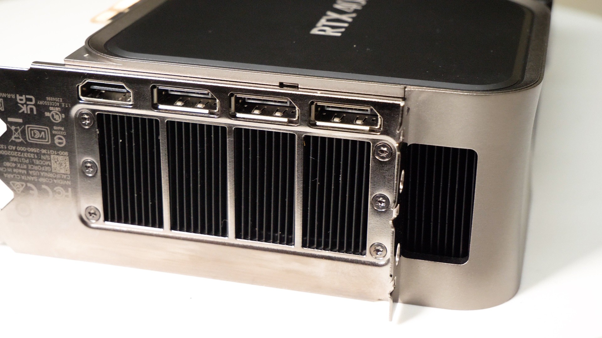 The Founders Edition we're looking at today arrives in the same packaging as the RTX 4090 and in the same excellent casing. The only difference is that while the same controversial 12VHPWR socket is on the card (yes, the melting one - and we're still waiting for definitive answers on why that happened) but this time you get a dongle adapter with just three eight-pin PCIe inputs. That's still more than enough, bearing in mind that the much more power-hungry RTX 3090 Ti shipped with the same adapter - and the RTX 4090 worked with it too. The uniform design across both Ada Lovelace cards also means that you're getting the same video options: one HDMI 2.1 and three DisplayPort 1.4a ports.