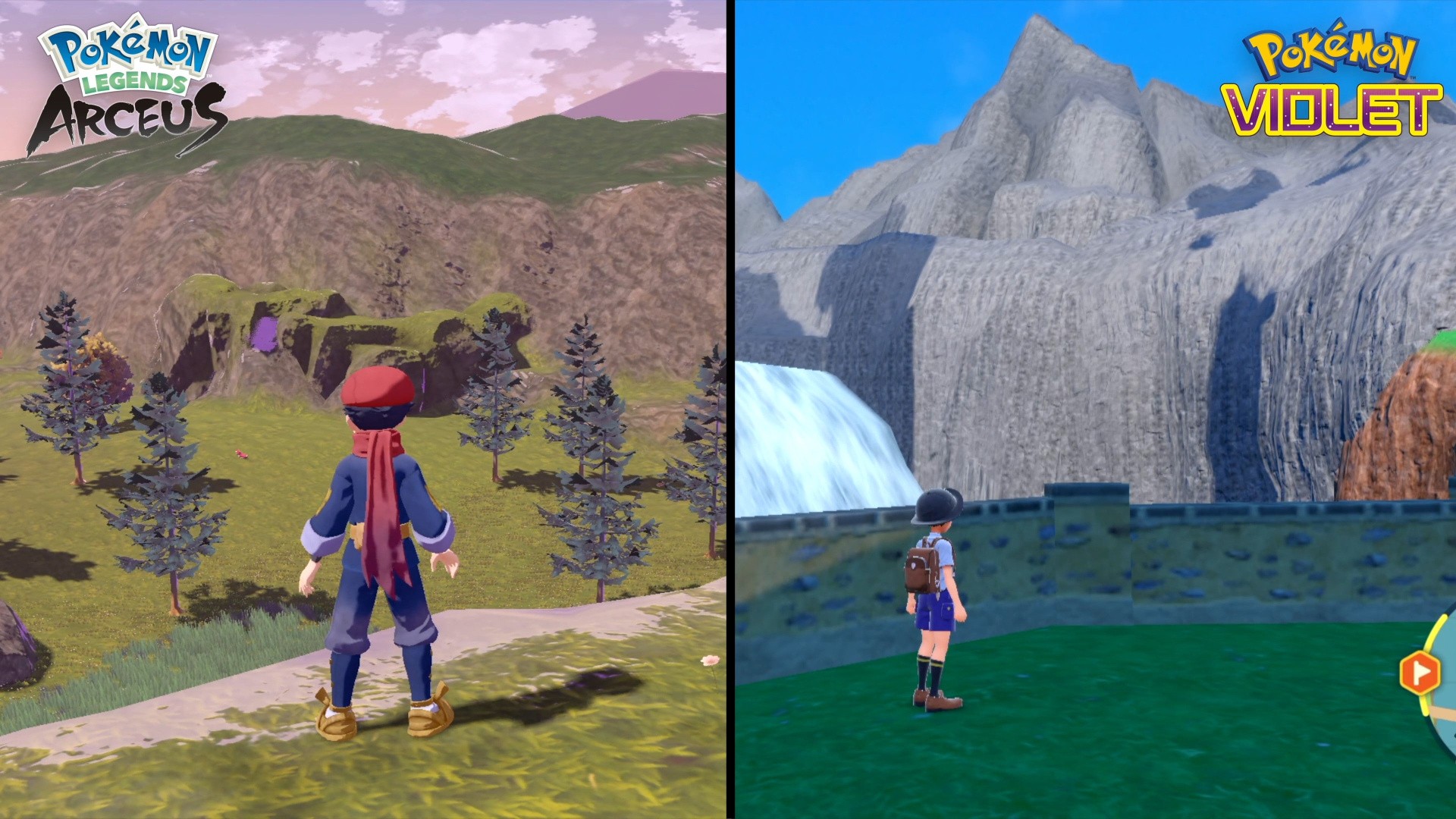 At the time of its release, Arceus wasn't exactly a top-flight visual experience, but it looks much better than Pokémon Scarlet and Violet. The terrain in Arceus is pretty nicely sculpted, with realistic-looking rock formations and reasonably high-quality texturework. Most of the terrain features in Violet look laughably simple, by comparison, with some of the most blatant texture tiling I've seen in a modern game, and the geometry is simple and crudely rounded. Even effects like cloud shadows are downgraded in the transition from Arceus to Scarlet/Violet.