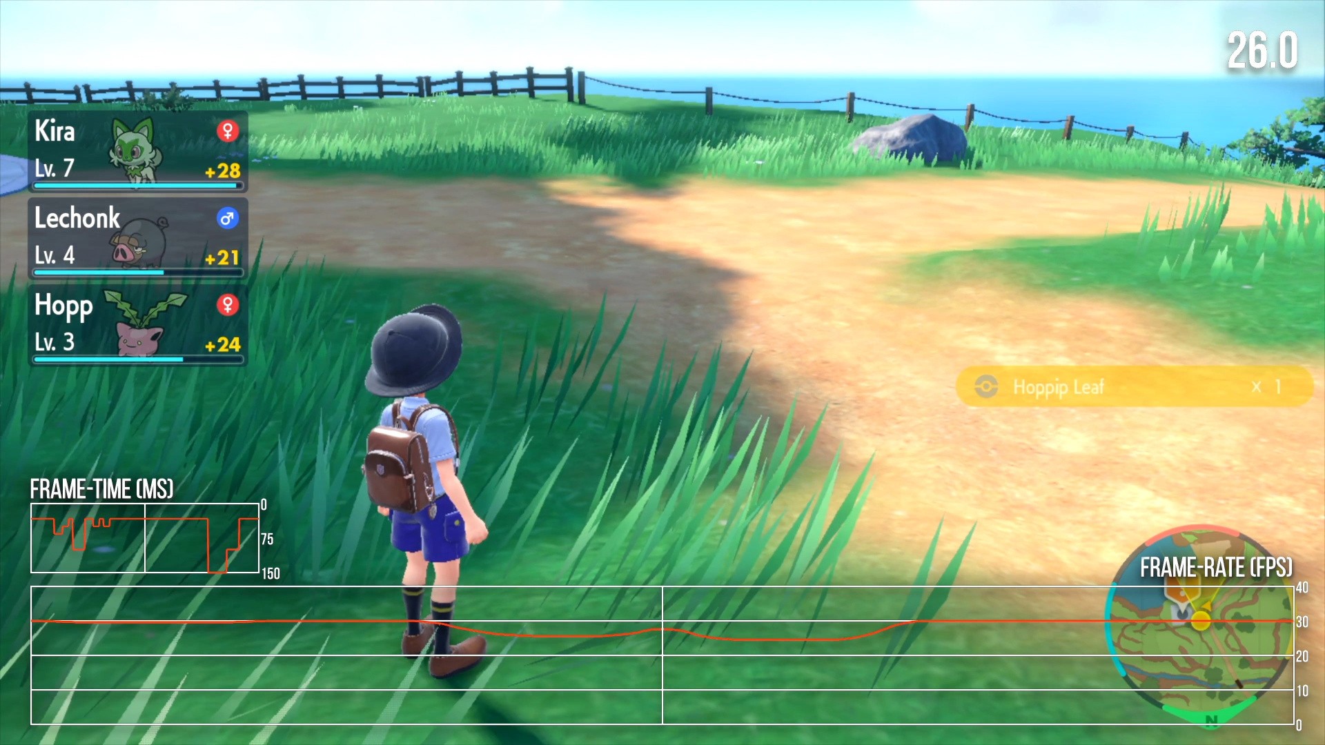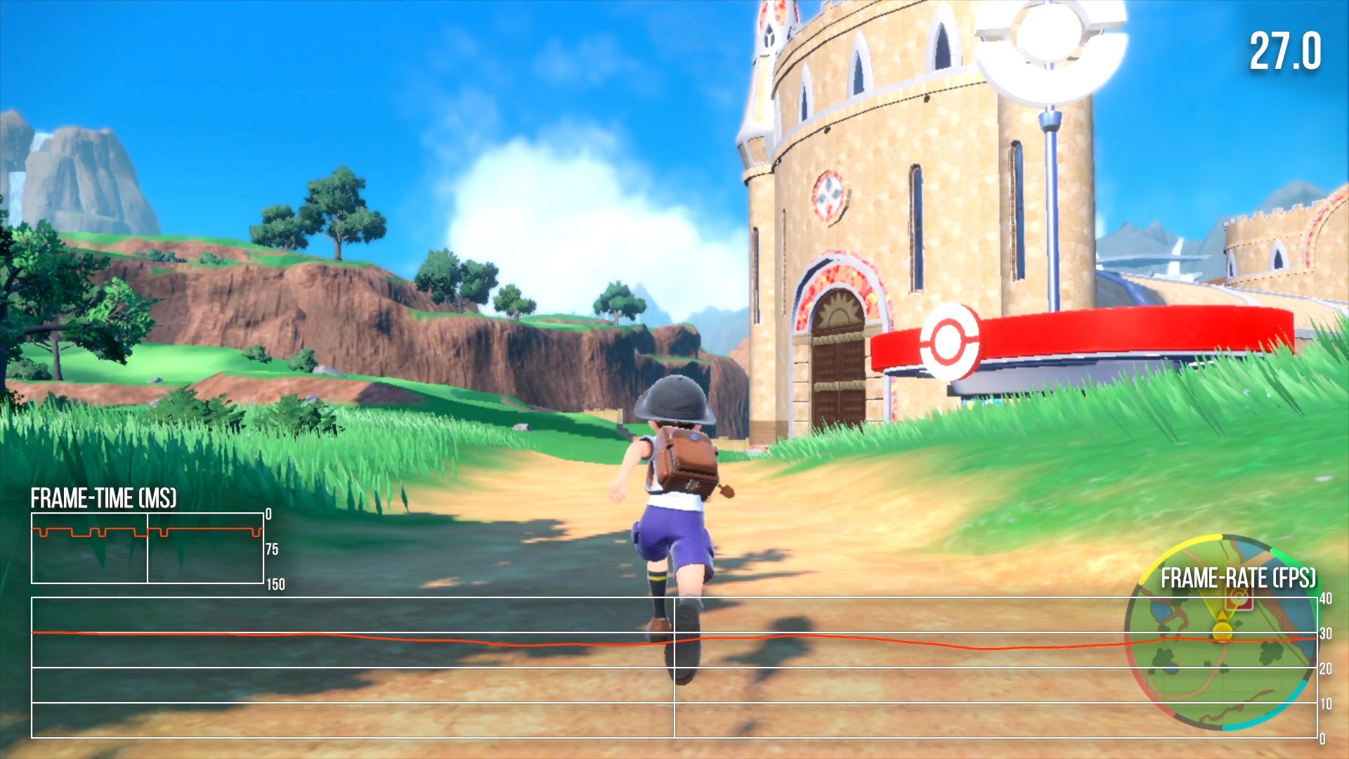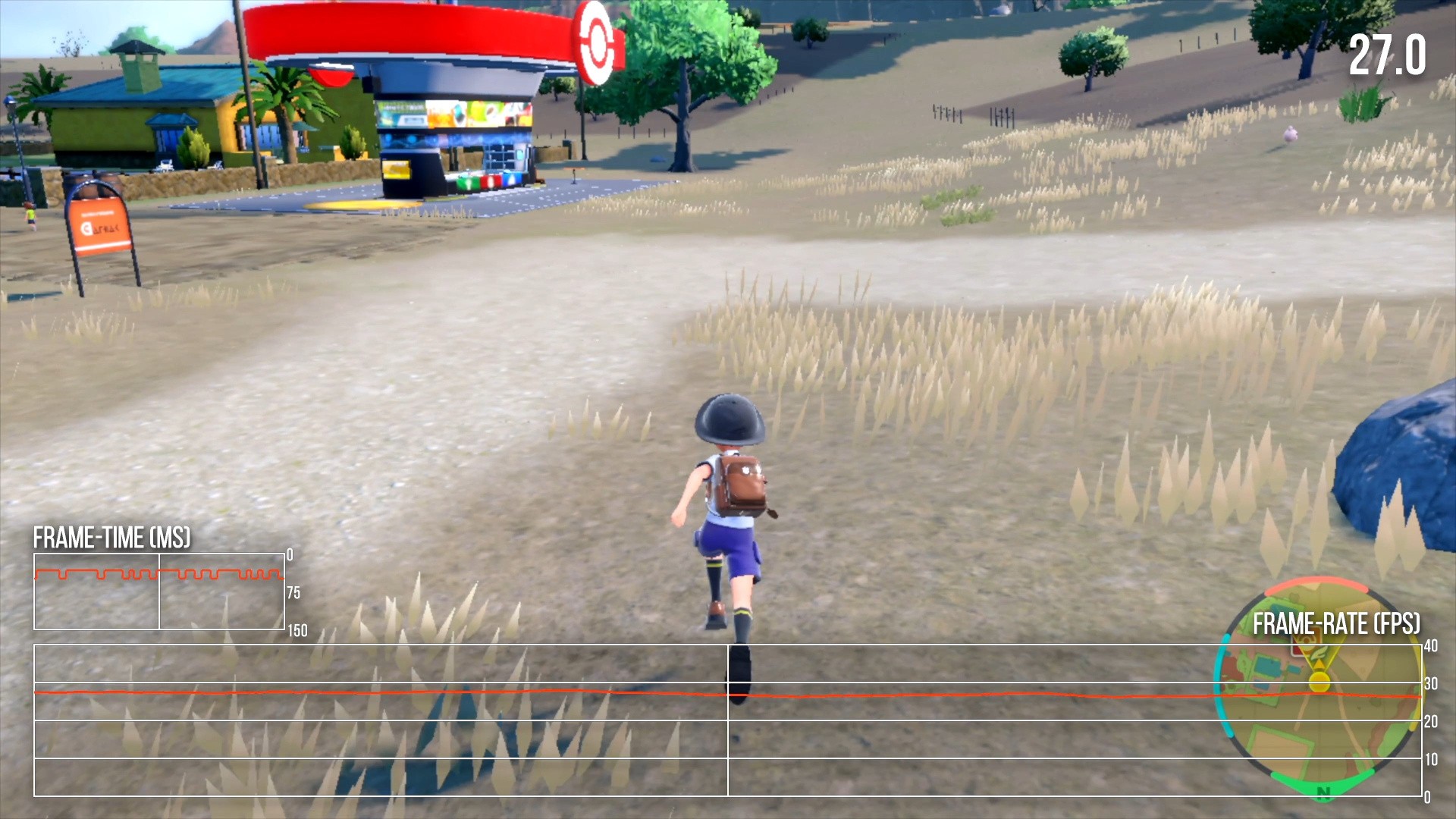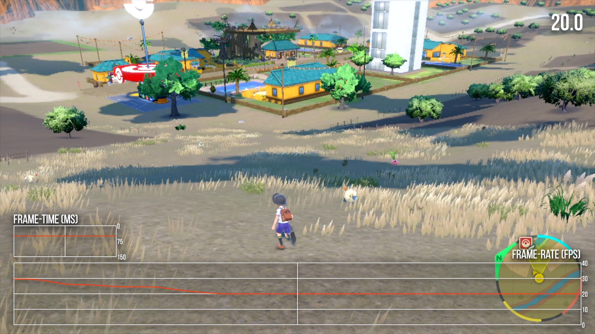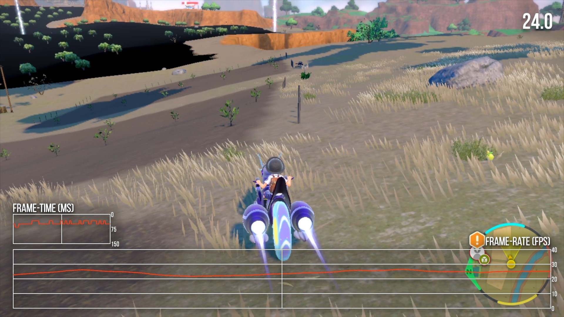 Pokémon Violet targets 30fps, but suffers from near-constant frame-rate dips and stutters. Frame-rates between 25 and 30fps are common during traversal, with occasional frame-time spikes to 100ms and above. It's a pretty unpleasant experience in general. Portable mode fares about the same as docked, with similar frame-rate drops and momentary hitches. At worst, Pokémon Violet can run at 20fps for extended periods, like in certain demanding cutscene sequences and when traveling through some of the game's towns. On the whole, it's a very unstable-feeling title. Pokémon battles fare somewhat better than traversal, but you will spend a lot of time moving through the open world which presents an unsteady and rough experience.