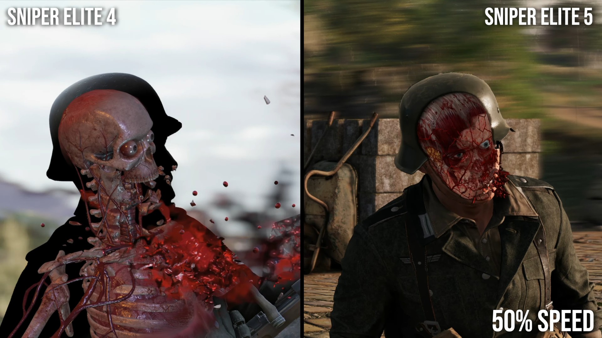 So resolution and performance are something of a mixed bag, but the graphics as a whole have made clear strides since the last Sniper Elite title five years ago. The first thing you'll notice is the game's gory x-ray cams appear a little less gristly this time around, with the disturbingly realistic deformations to character meshes being somewhat masked by particle effects and blood splatter. There's still some technically complex changes to the mesh going on, but the older and more obvious approach in Sniper Elite 4 arguably produces a more satisfying result.
