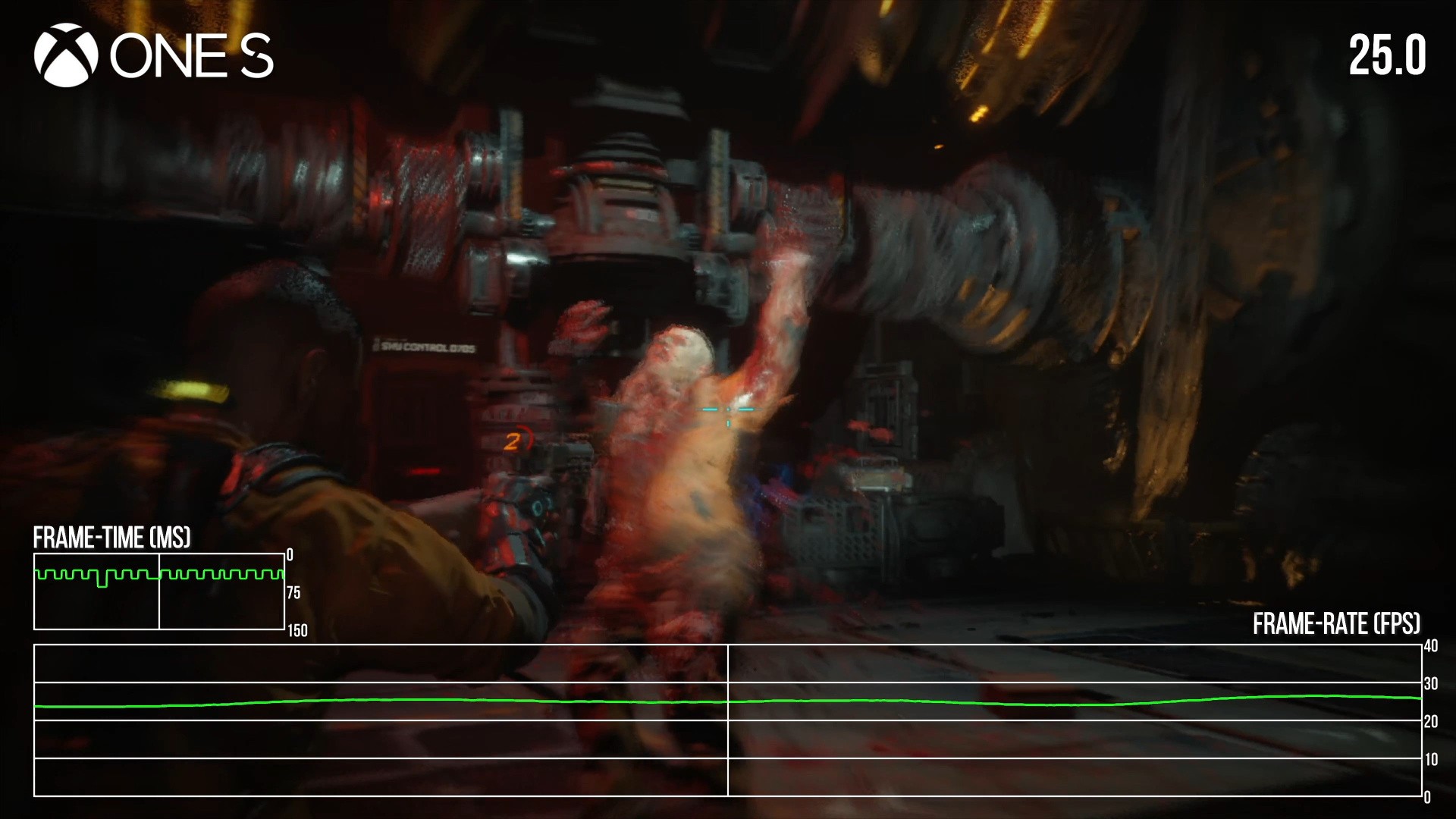 So visual settings are reasonable, though comprehensively downgraded compared to current-gen, and image quality is pretty good for the most part. But how does performance fare? This is where the last-gen systems are truly taxed, unfortunately. First though, we should get something out of the way - the cutscenes. Unsurprisingly, The Callisto Protocol targets 30fps on last-gen consoles, but that isn't the initial impression you get from starting the game. After the opening pre-encoded cutscene, the real-time sequence that follows runs at roughly 24fps across all last-gen consoles. It clearly stutters and has an odd frame cadence of alternating 33ms and 50ms frames. This holds true for all the real-time cutscenes in the game that I encountered. All of them run at about 24fps, with occasional frame-time spikes and stutters, but never really getting anywhere near 30. This applies to shorter cutscene sequences as well, like when checking this container near the start of the game, or when the player opens certain doors. This cap seems to be intentional and likely allows for higher image quality via dynamic resolution scaling - a trick also used in The Matrix Awakens.